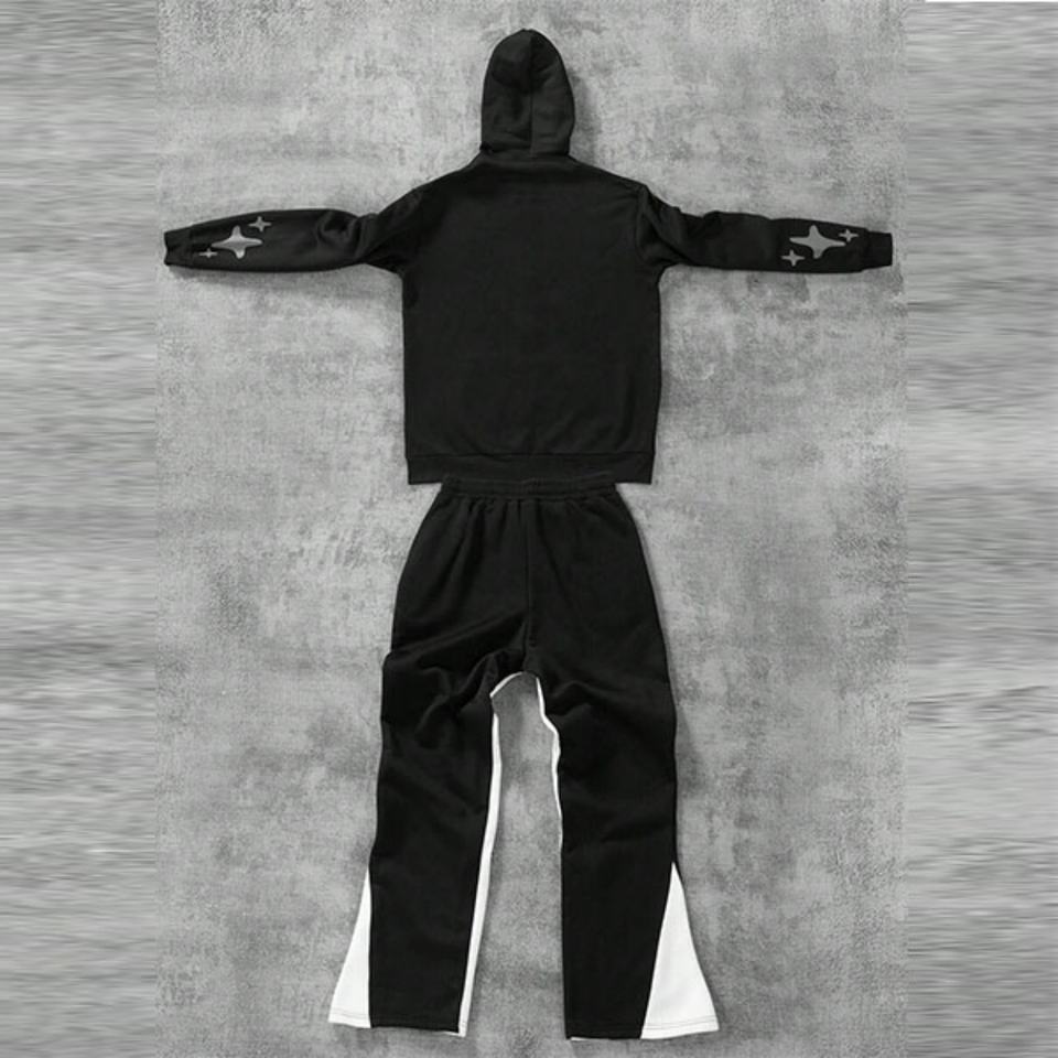 Ensemble de survêtement streetwear personnalisé en molleton bouclette avec sweat à capuche zippé coupe oversize et pantalon de survêtement évasé, imprimé sérigraphié et brodé