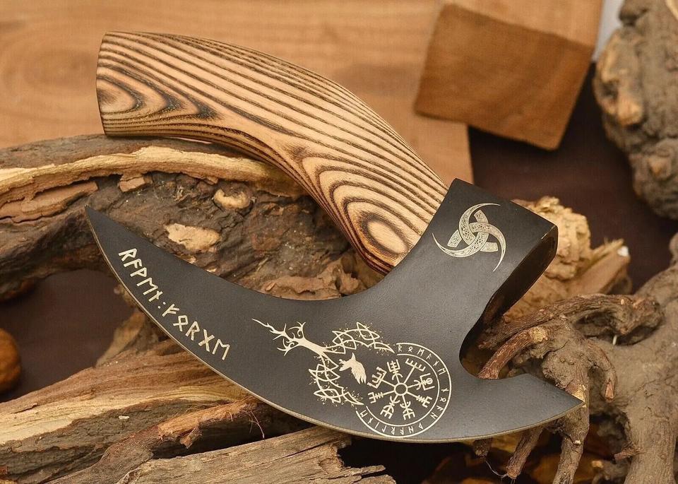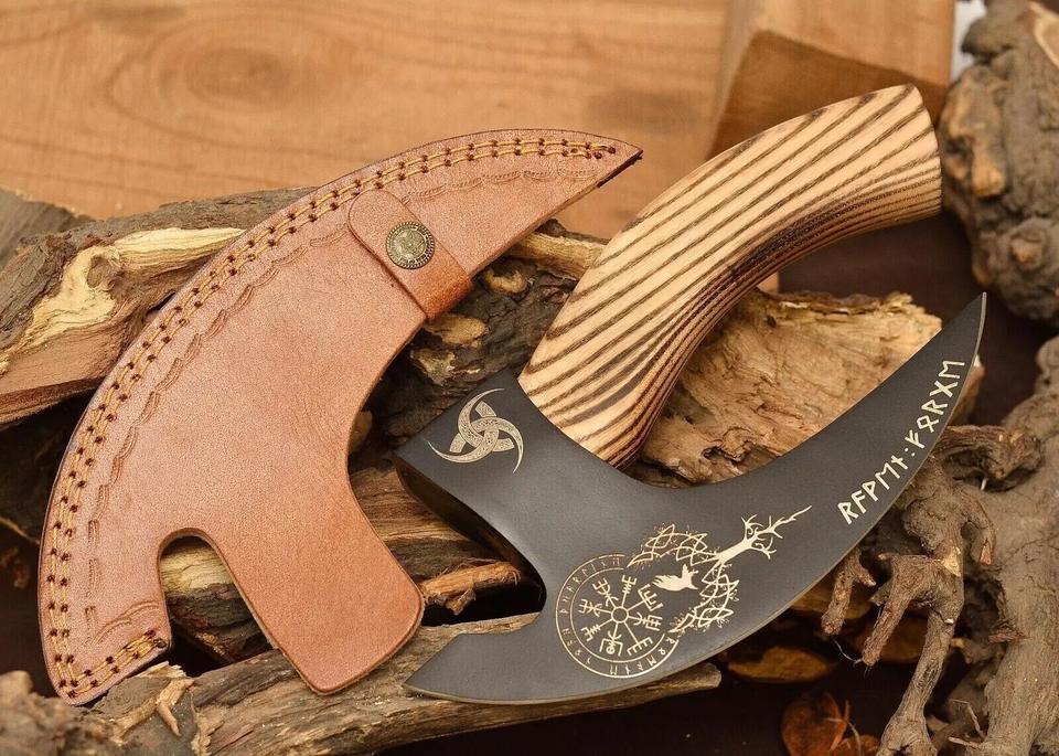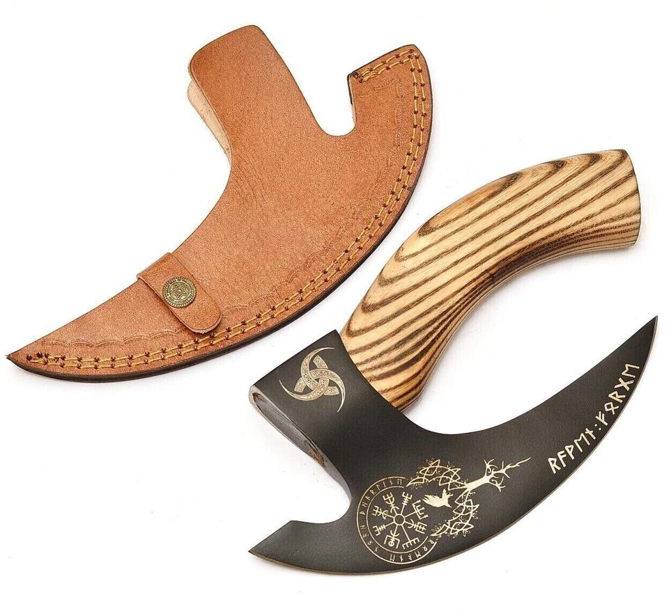 Hache à pizza Viking personnalisée en acier à haute teneur en carbone forgé à la main avec manche en bois gaine en cuir de qualité industrielle pour les chefs