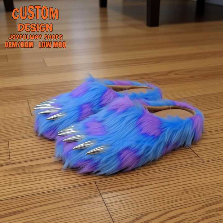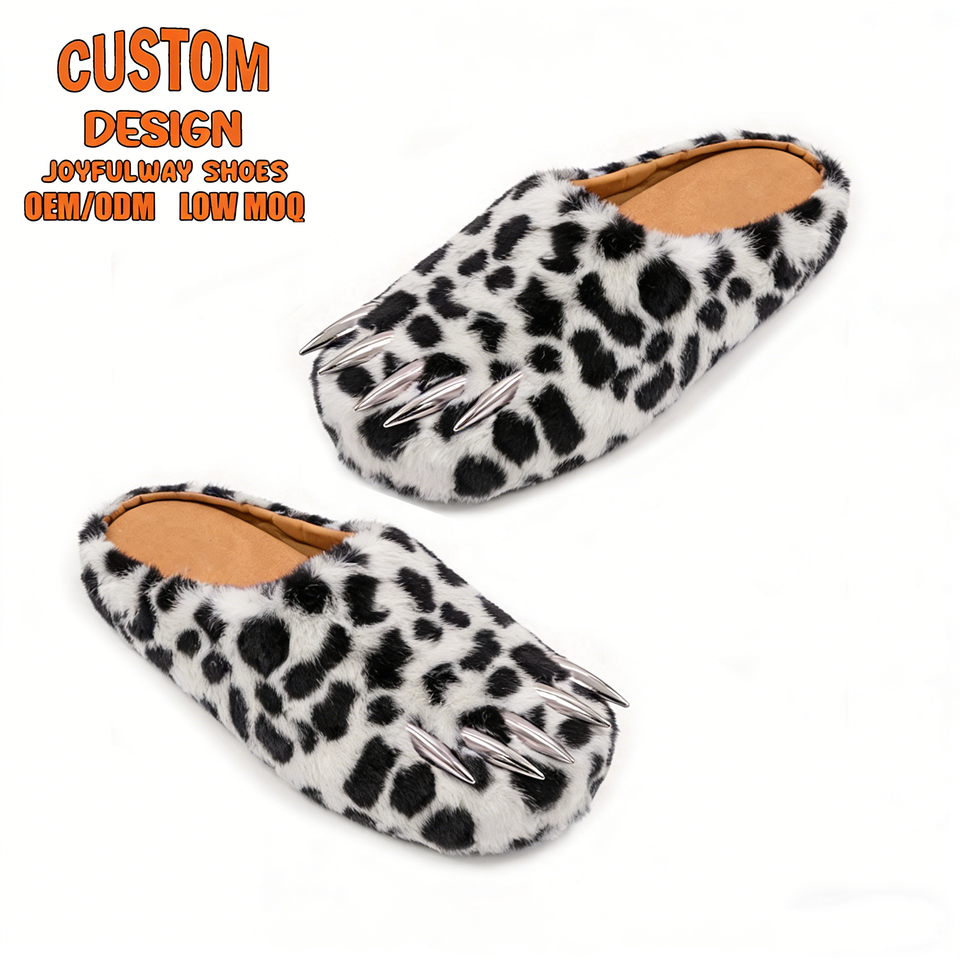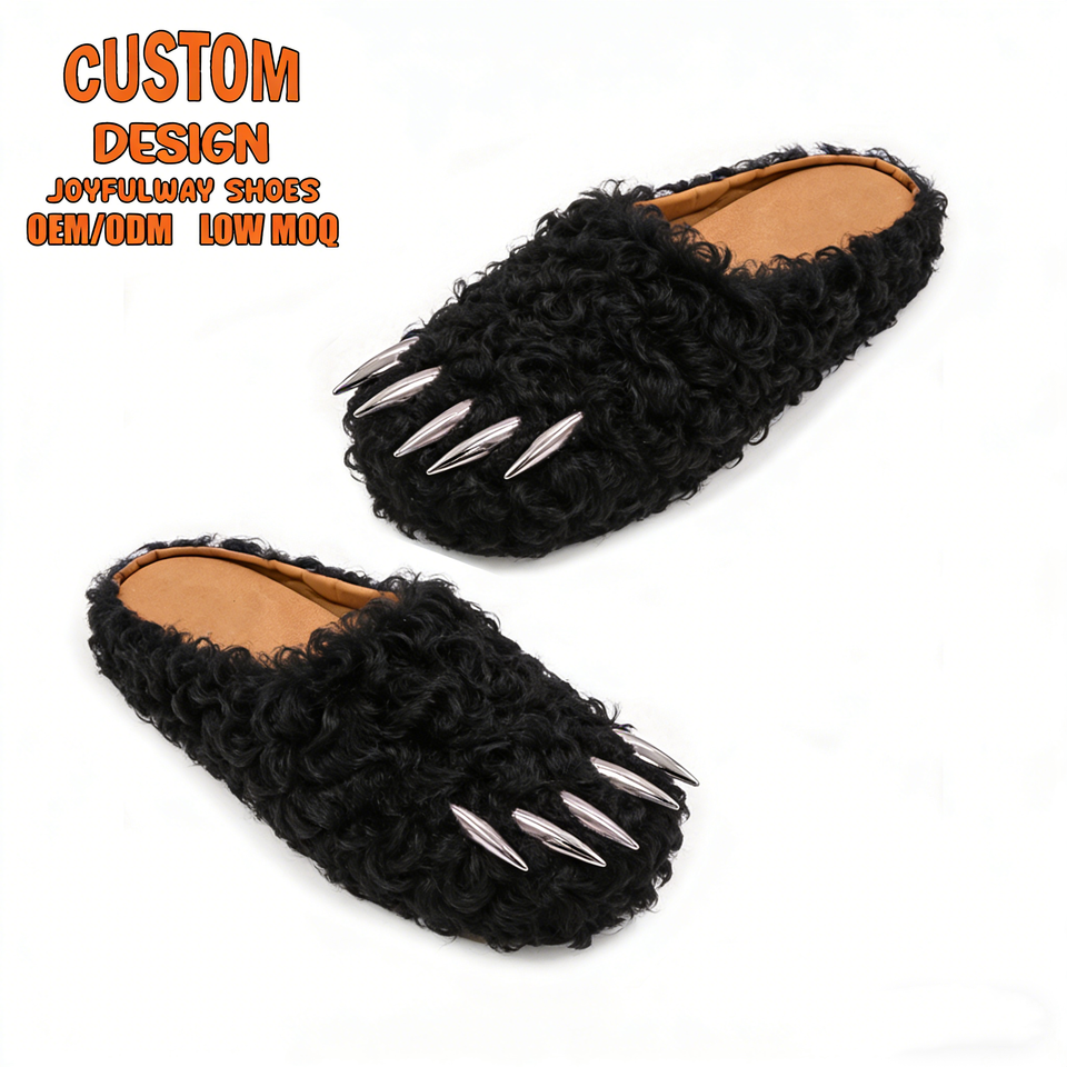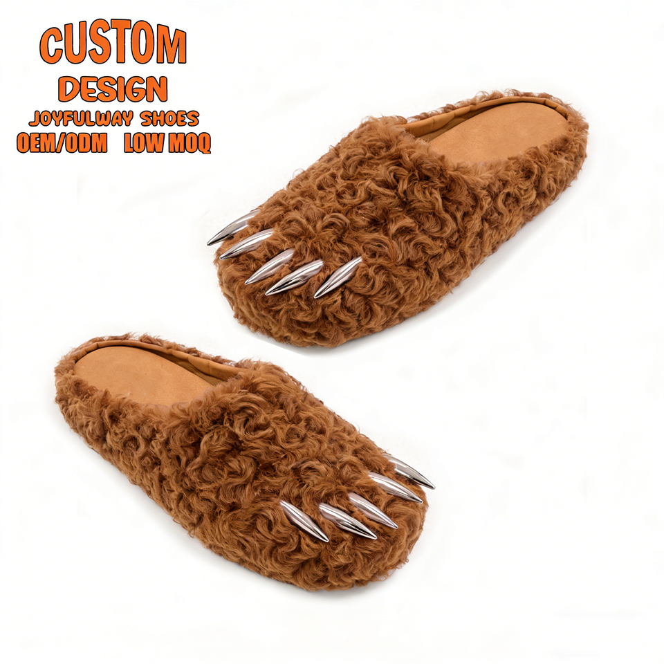 Mules en peluche personnalisées de créateur, avec logo sur mesure, pour hommes, en fausse fourrure, motif patte d'ours, avec griffes métalliques