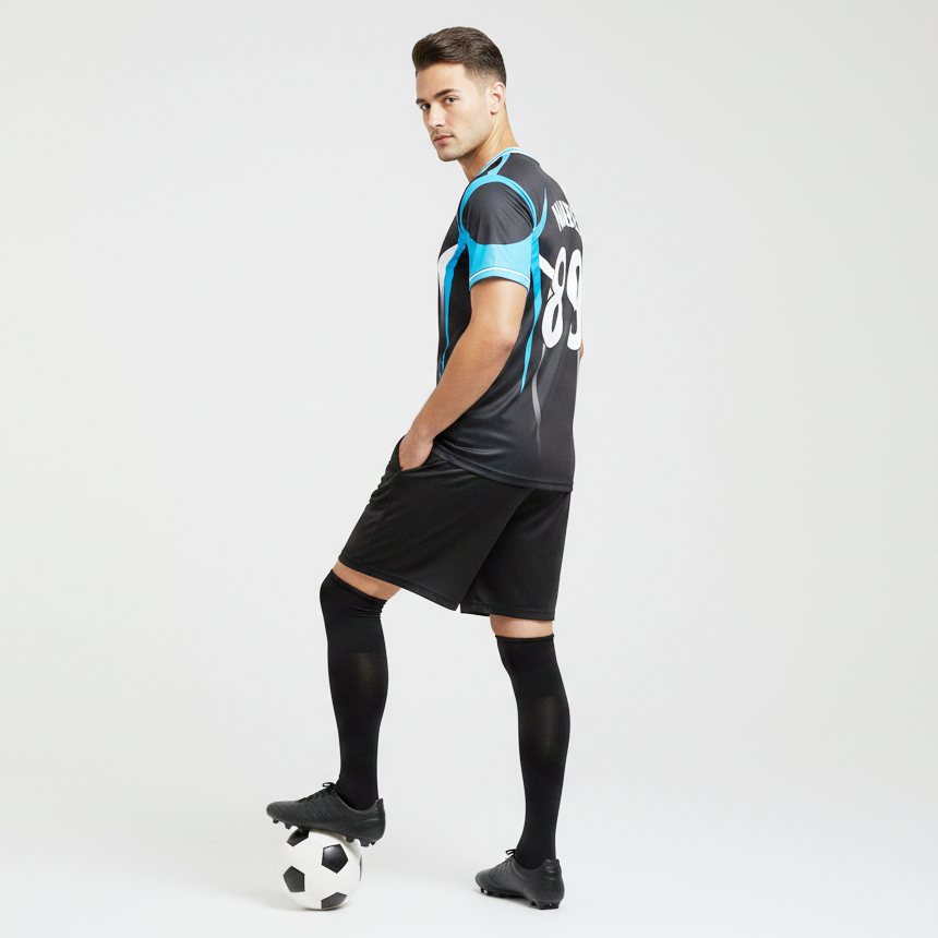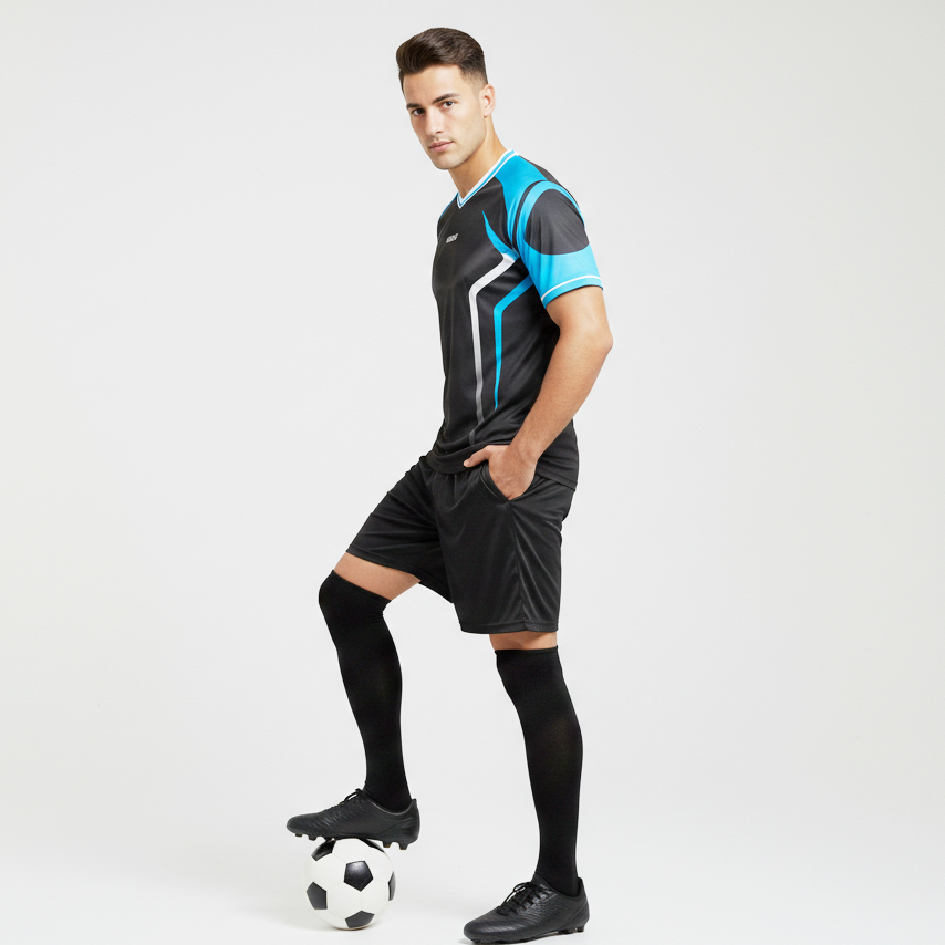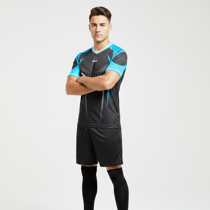 Maillots de football professionnels sur mesure, service OEM, 100% polyester, col en V court, respirant, séchage rapide, noir, bleu ciel