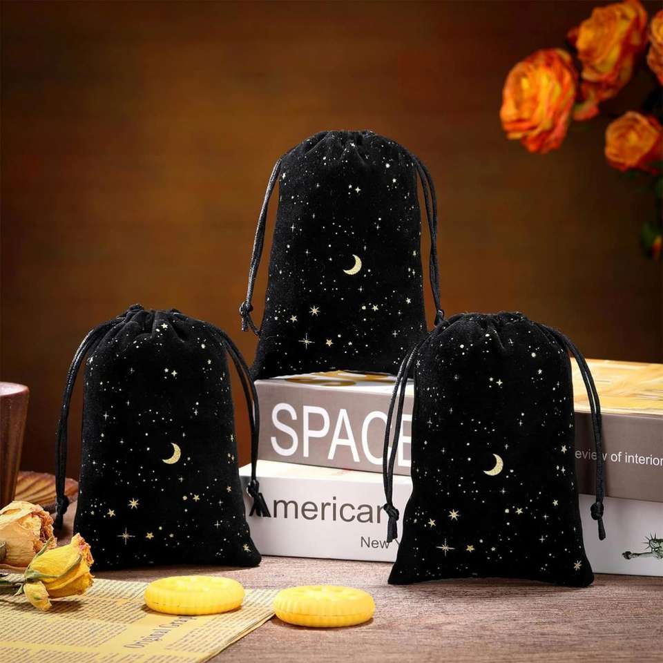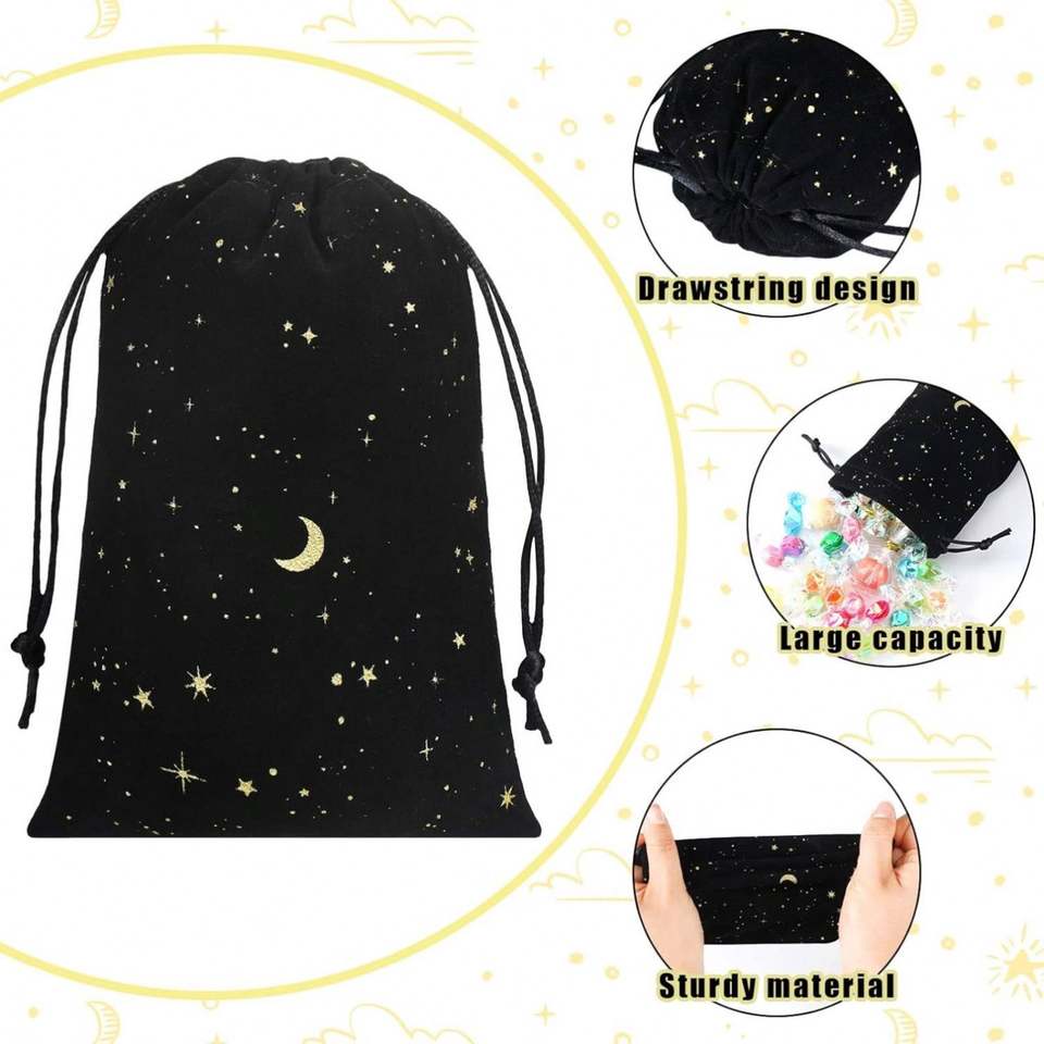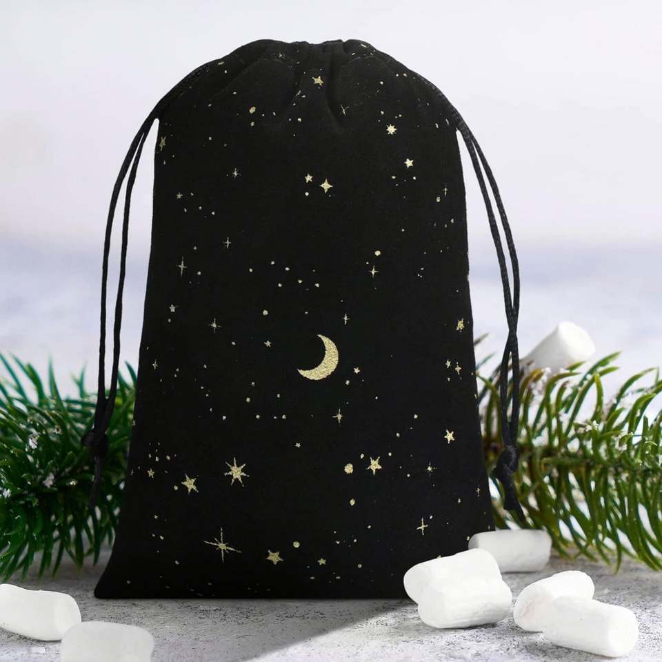 Sac à poussière en velours noir personnalisé avec cordon de serrage, motif lune et étoiles, pour bijoux, cadeaux, mariage, anniversaire, bougies