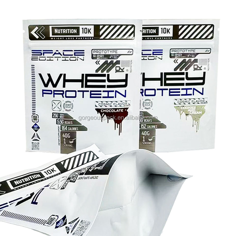 Sacs Mylar personnalisés à fermeture éclair pour poudre protéinée, impression numérique, faible MOQ, refermables, type stand-up