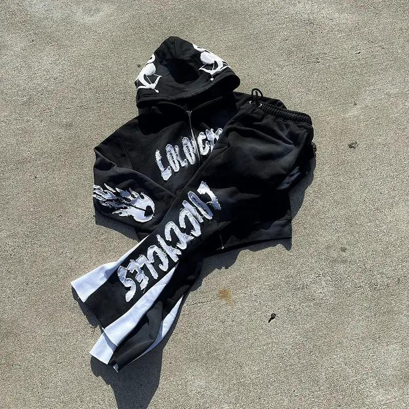 Ensembles deux pièces personnalisés avec broderie appliquée et imprimée, pantalons de survêtement évasés unisexes, effet vieilli, délavés à l'acide, pour homme