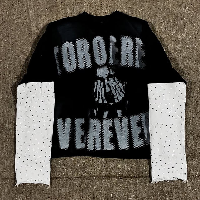 T-shirt pour homme surdimensionné à double couche en coton avec broderie usée personnalisée, pierres et motif imprimé