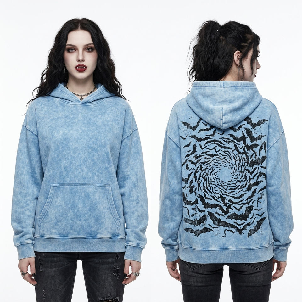 Sweat à capuche bleu clair vieilli personnalisé, ourlet déchiré, motif crâne et chauve-souris style Pastel Goth, coupe oversize, en polaire de haute qualité