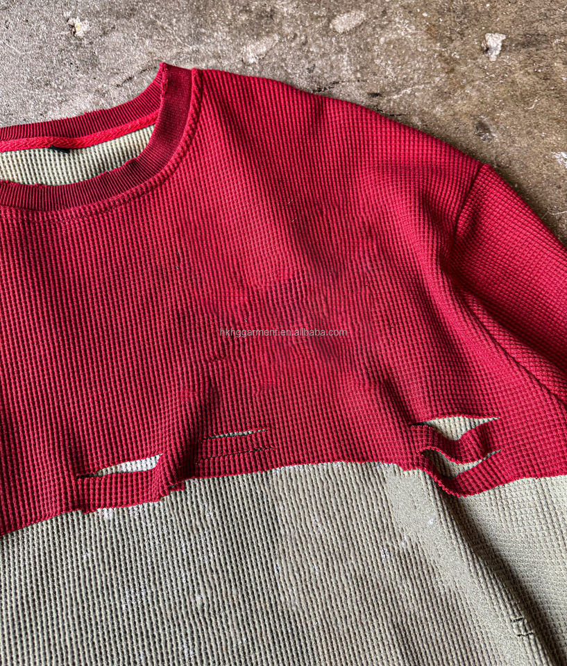 T-shirts à manches longues double couche en coton gaufré, coupe délavée, ourlet brut, effet vieilli, pour hommes