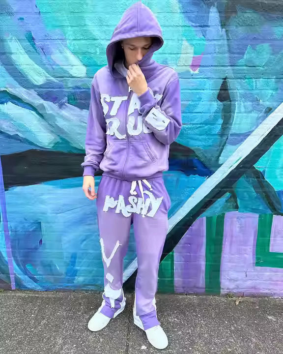Ensemble survêtement homme personnalisé : sweat à capuche double couche effet vieilli avec broderie et patch, et pantalon de jogging délavé à l'acide