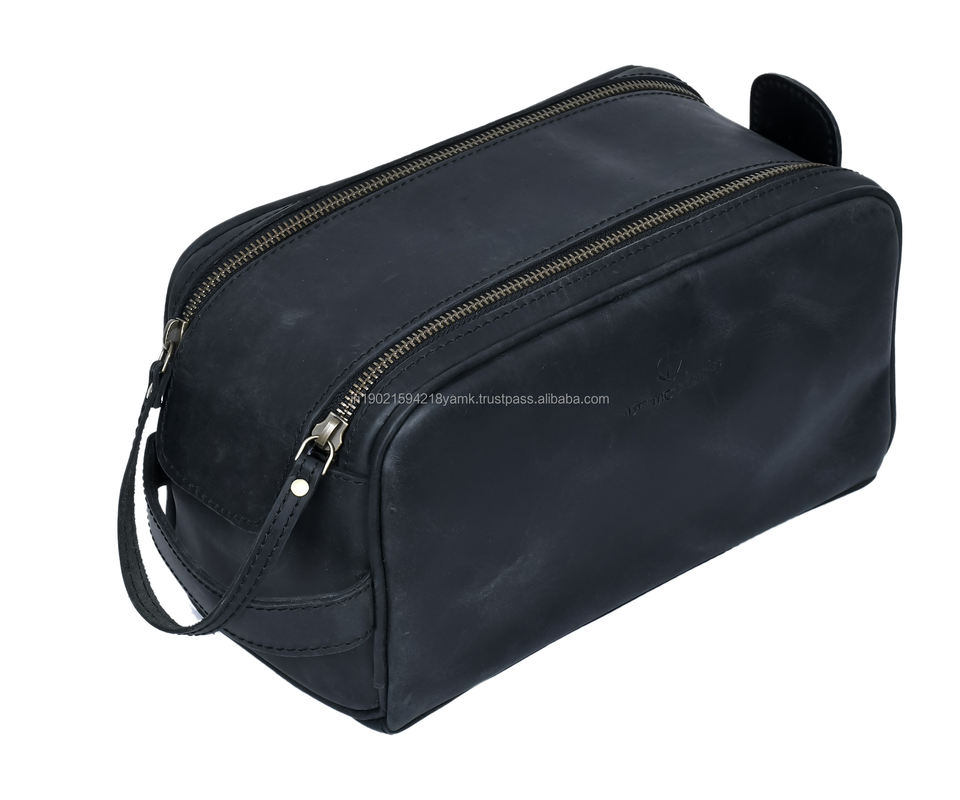 Sac de toilette pour homme en cuir véritable à double fermeture éclair, sac de voyage pour cosmétiques