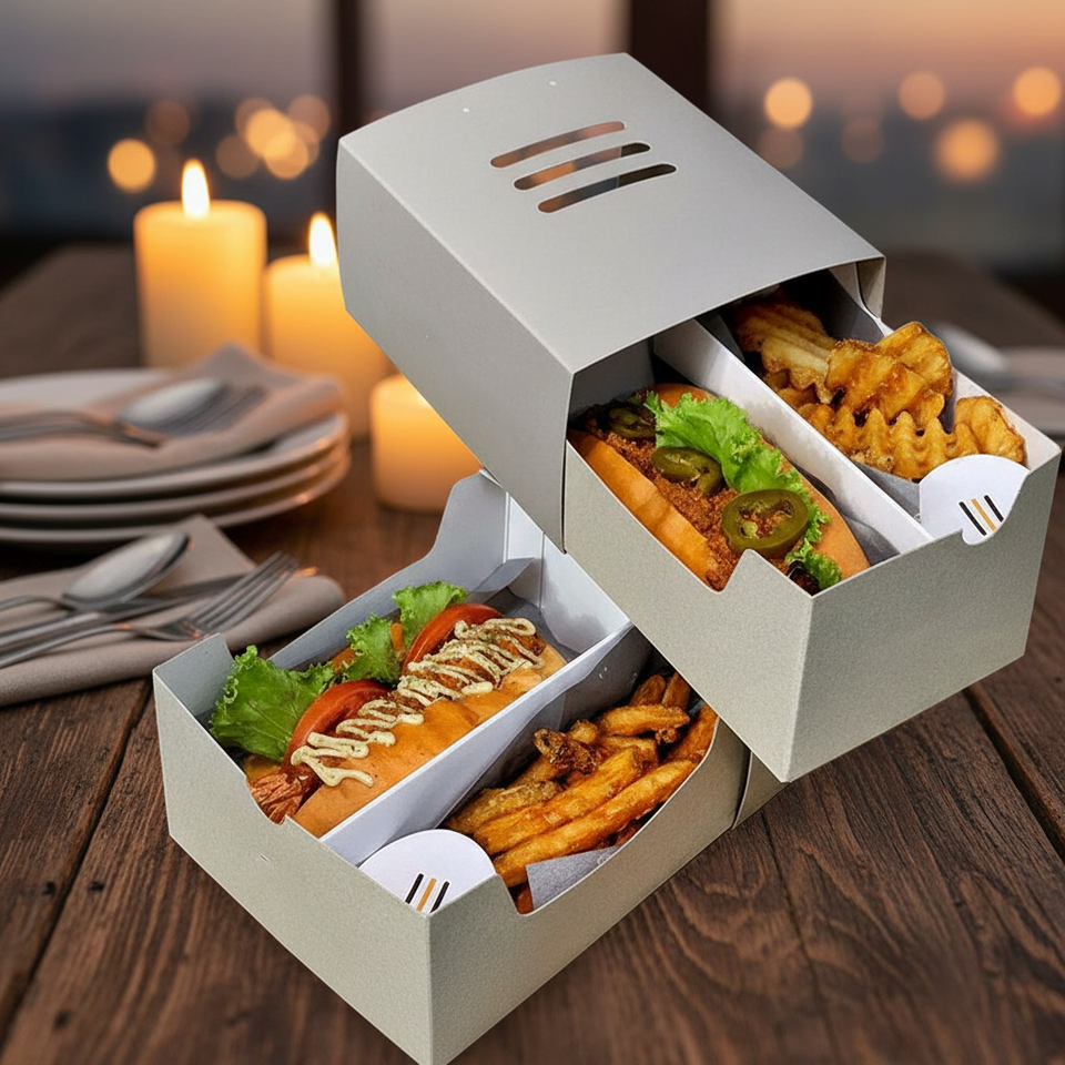 Boîte personnalisée en carton en forme de bateau pour hot-dogs, gaufres, burgers et corndogs, avec couvercles