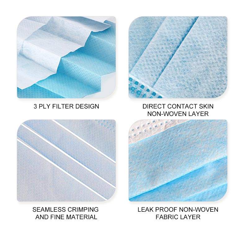 Masque facial médical jetable en tissu non tissé bleu anti-poussière personnalisé, masque facial à 3 plis
