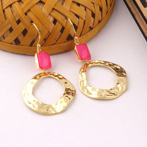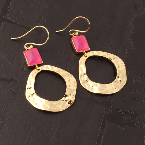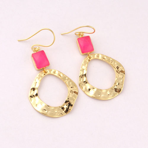 Boucle d'oreille personnalisée forme rectangle calcédoine fuchsia métal irrégulier texture martelée boucle d'oreille plaqué or cadeaux d'anniversaire gouttes