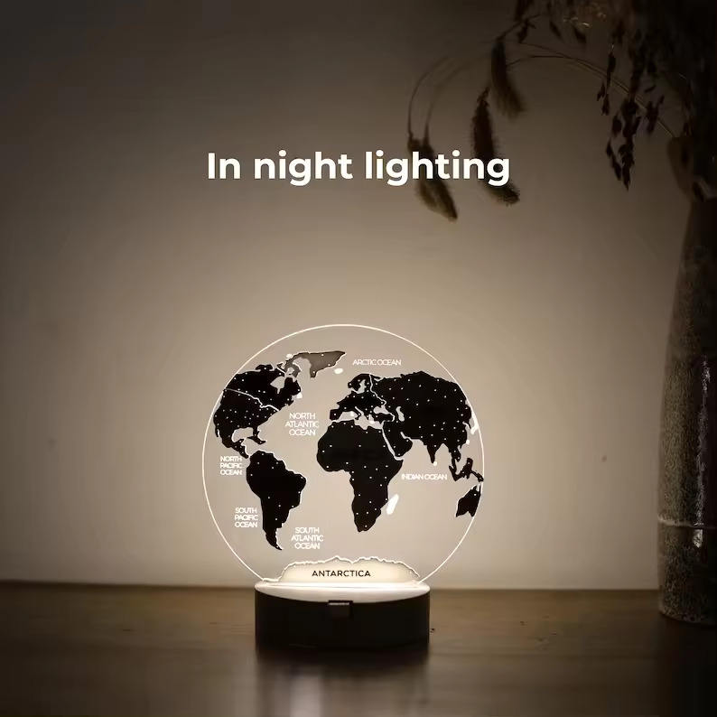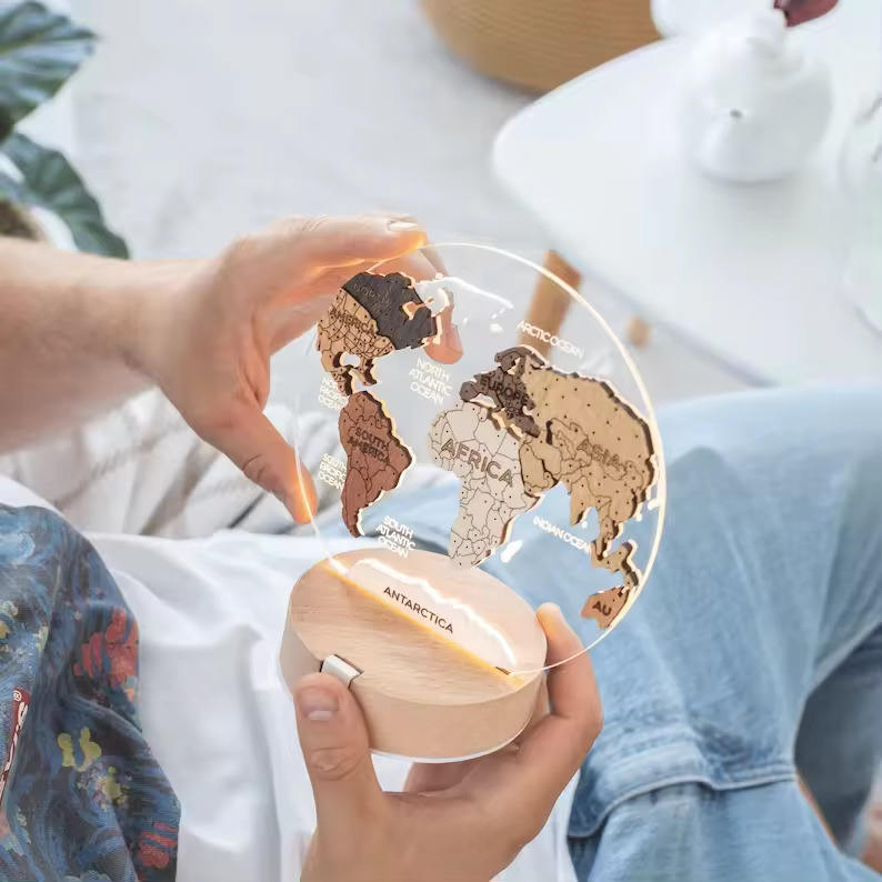 Veilleuse 3D écologique personnalisée décoration style nautique carte du monde en bois fait à la main en bois poli cadeau de voyageur du monde