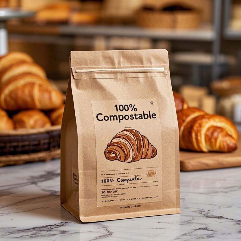 Pochette sur pied en papier kraft biodégradable écologique personnalisée avec serrure à cravate en étain de stratification pour emballage de pain grillé et de croissant de boulangerie