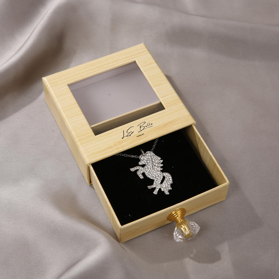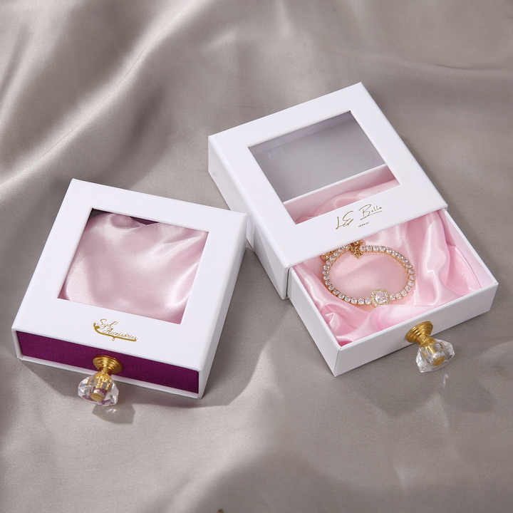 Boîte à bijoux écologique personnalisée avec fenêtre en PVC, en carton et avec poignée en cristal pour l'emballage de colliers, avec logo personnalisé
