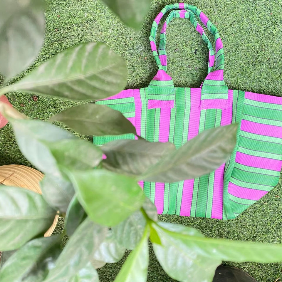 Sac à provisions à rayures tissé en plastique à fermeture éclair réutilisable écologique personnalisé sacs de plage recyclés fabriqués à la main sacs à cosmétiques étuis