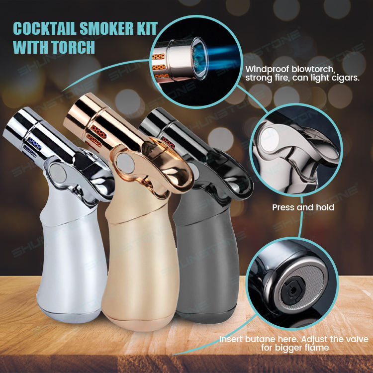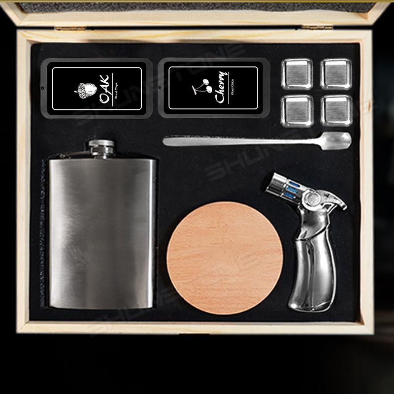 Kit de fumage pour cocktails et whisky SHUNSTONE personnalisé et écologique avec torche, flacon de whisky de 8 oz et coffret cadeau en bois