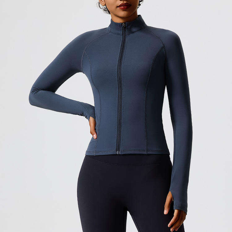 Veste de yoga personnalisée éco-responsable zippée à manches longues pour femme avec trous pour les pouces, respirante, séchage rapide, coupe ajustée