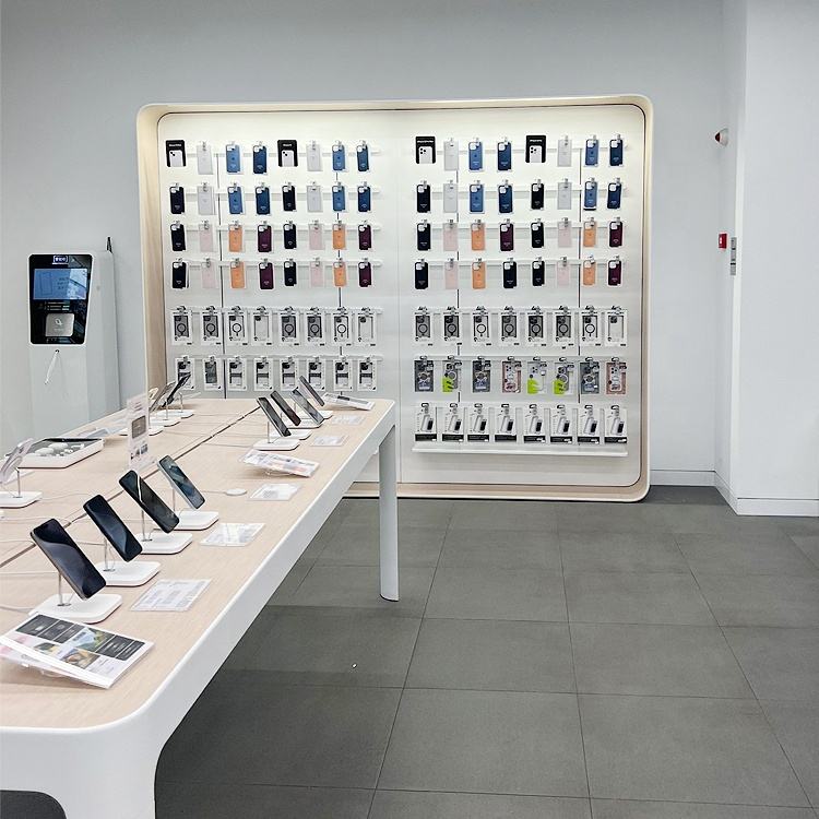 Conception personnalisée de décoration de boutique électronique, mobilier d'exposition pour téléphones portables, comptoir d'exposition pour magasin de téléphonie mobile