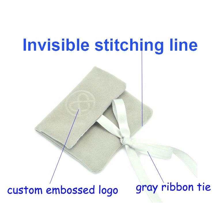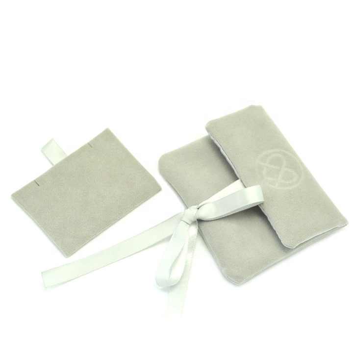 Pochette à bijoux enveloppe en daim gris avec logo en relief personnalisé et insertion de panneau de carte collier