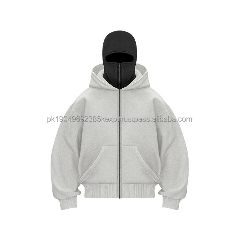 Sweat-shirt et sweat à capuche pour homme avec masque facial, imprimé brodé personnalisé, fermeture éclair, lavage à la pierre, délavé, déchiré, style balaclava ninja