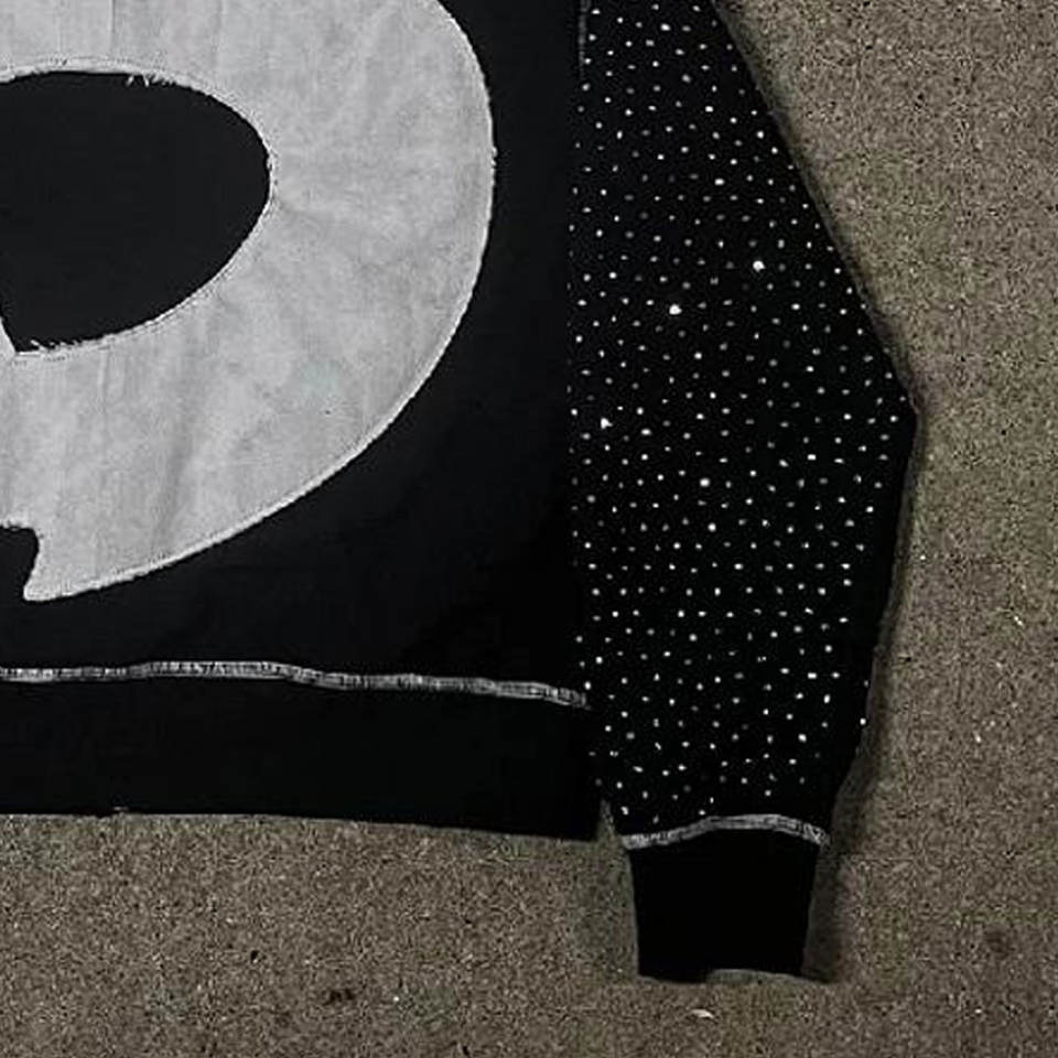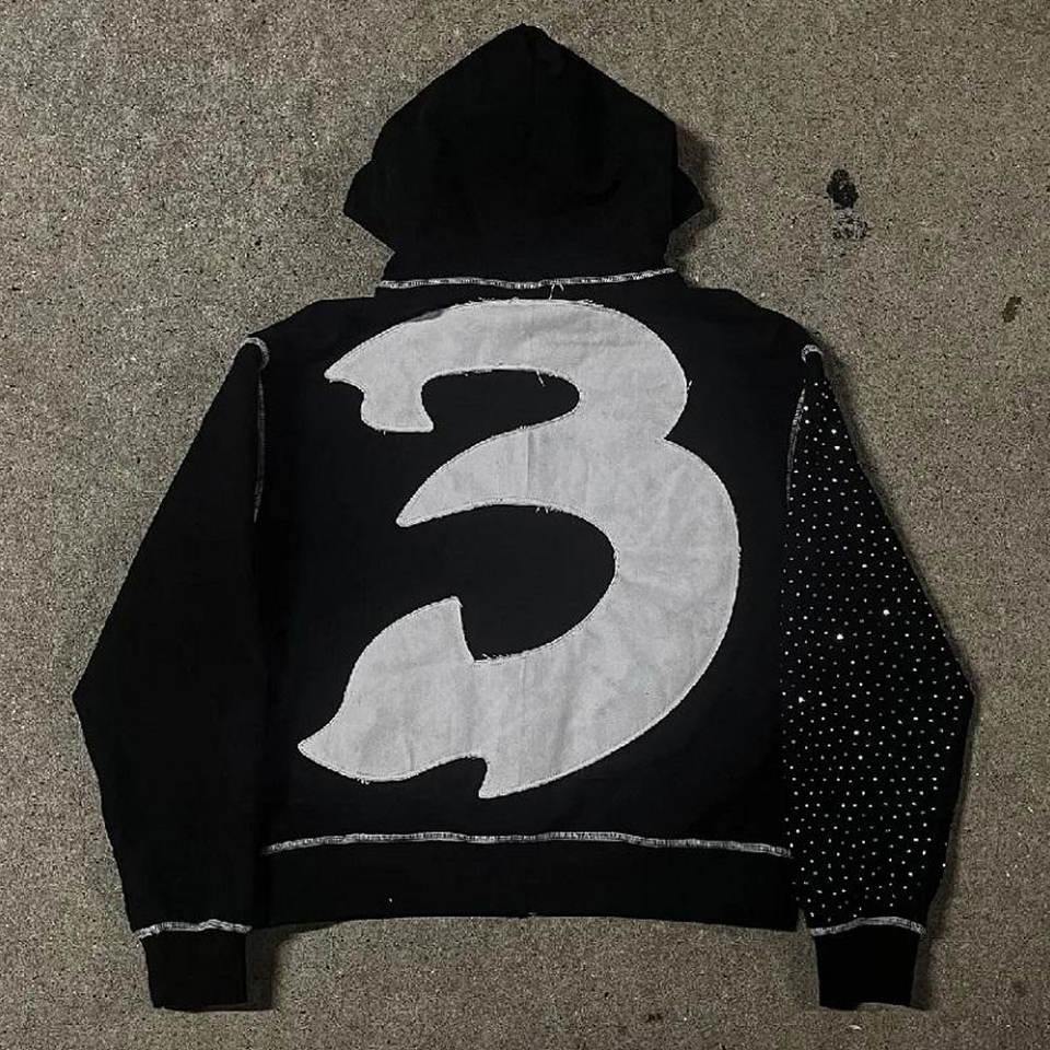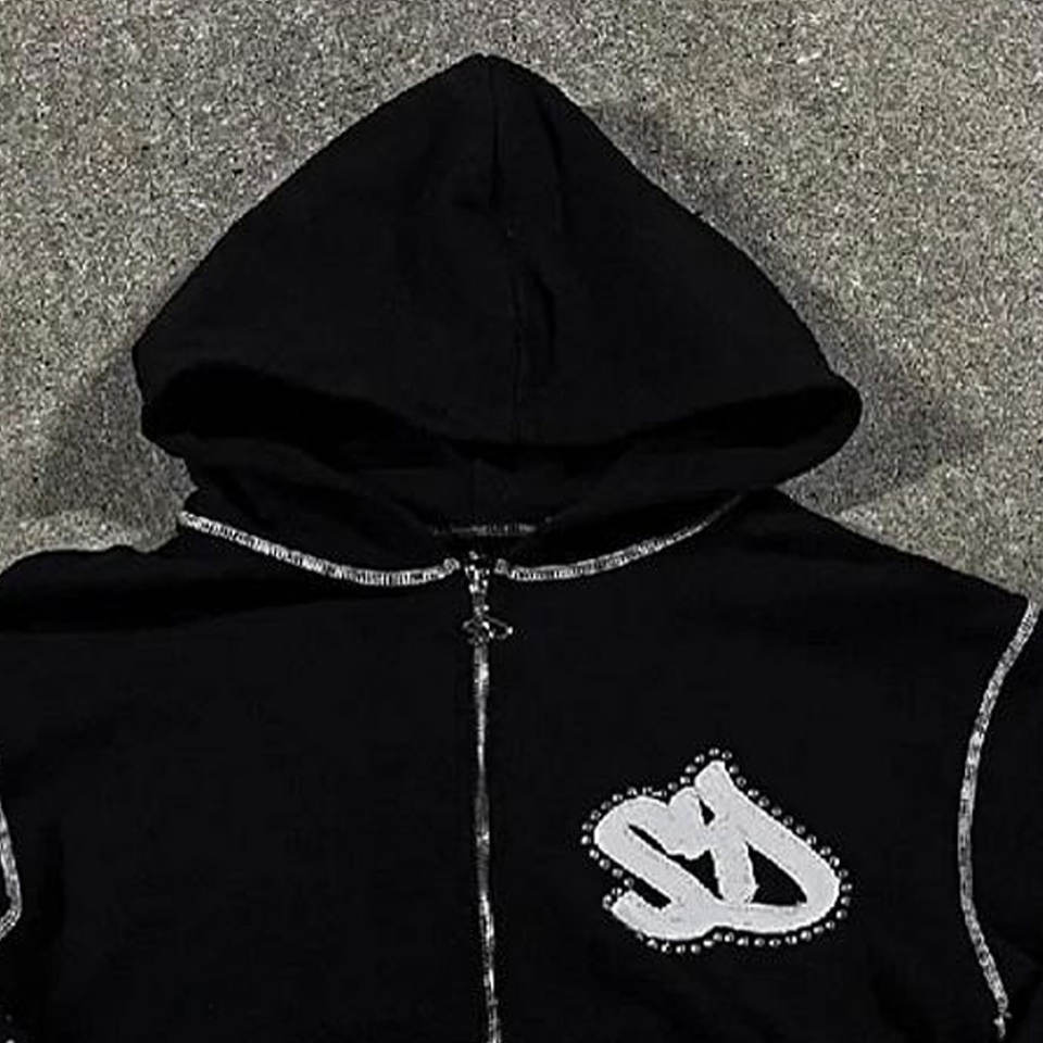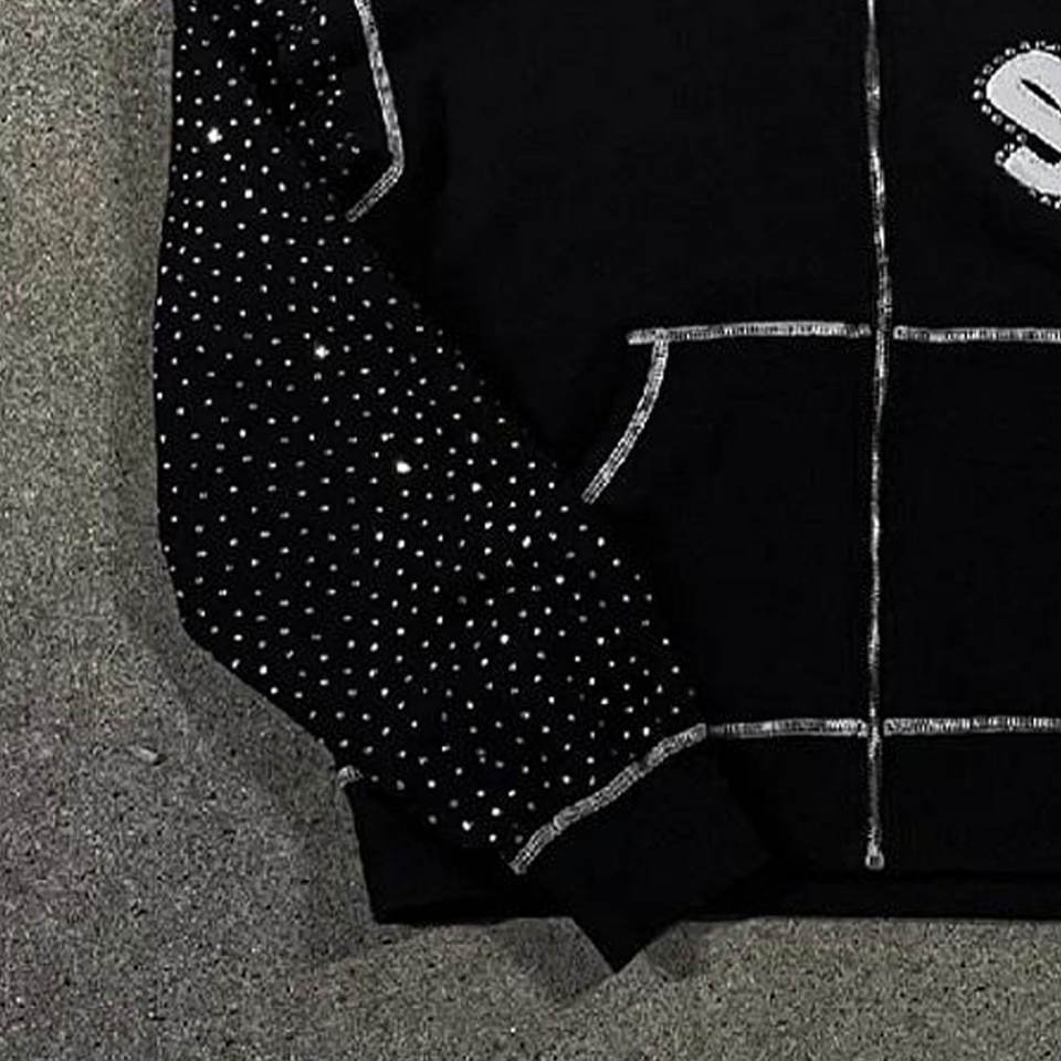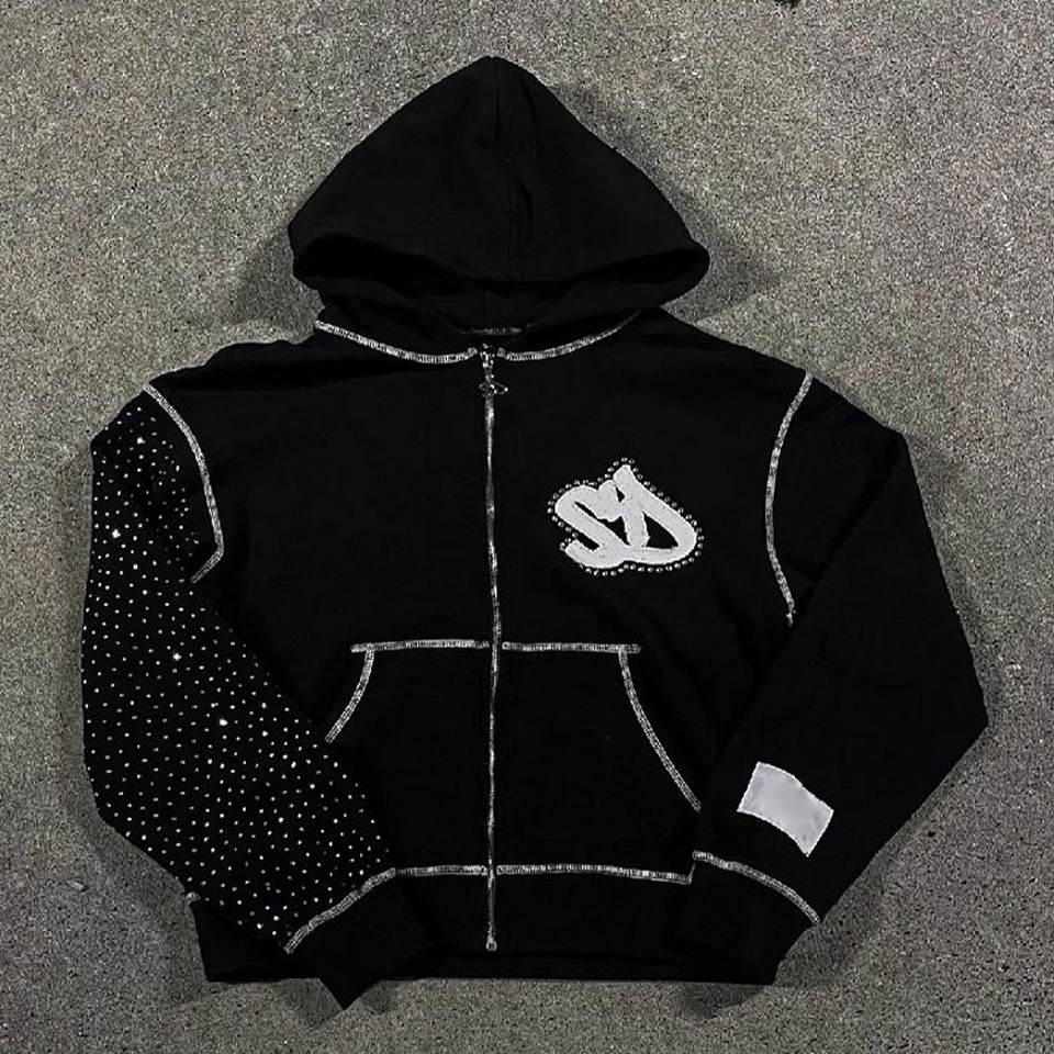 Sweat à capuche zippé pour homme en molleton bouclette, coupe régulière, grammage lourd, style streetwear, avec broderie personnalisée, strass et cristaux de luxe, 100%
