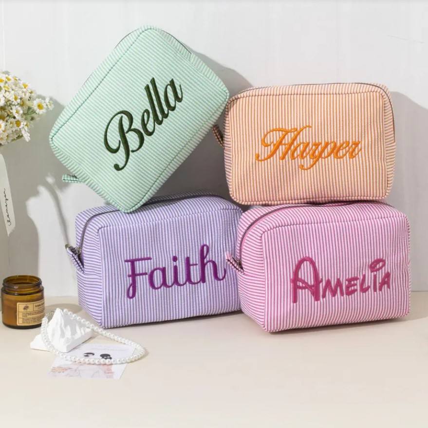 Pochette de maquillage personnalisée en seersucker brodé avec nom, monogramme, lettre, fermeture éclair, trousse de toilette de voyage, cadeau de mariage