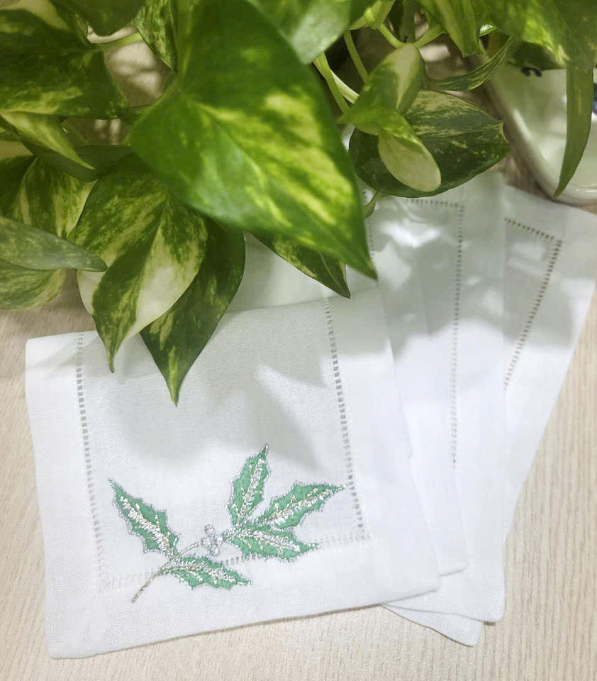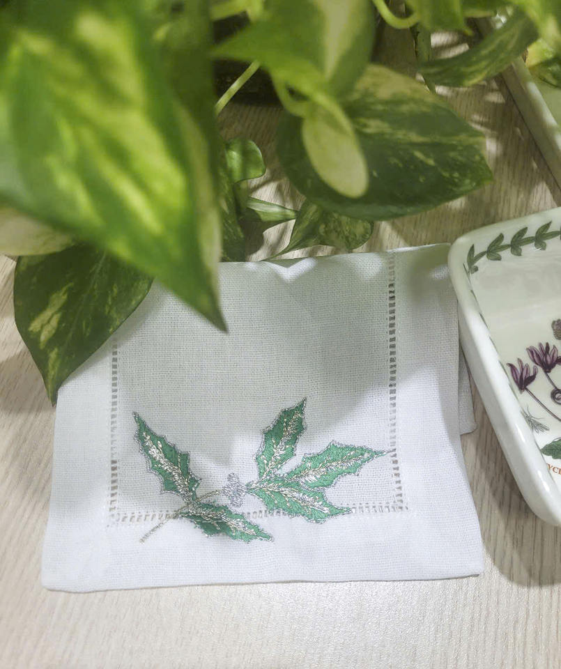 Serviettes de cocktail en coton blanc brodé personnalisé de 6x9 pi, conception de feuille verte, serviette de boisson pliée pour la maison ou l'hôtel
