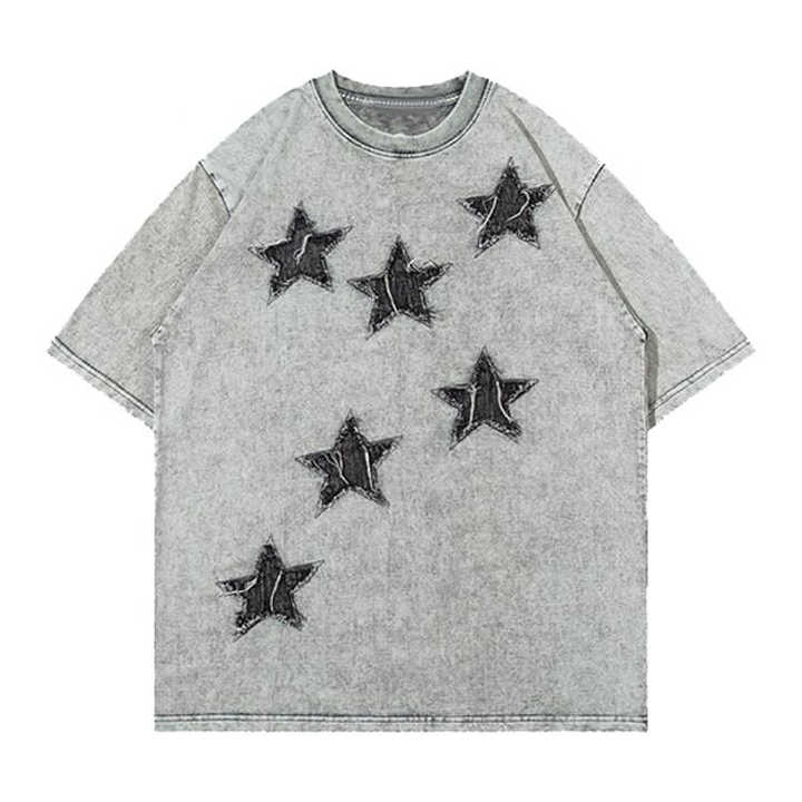 T-shirts surdimensionnés pour hommes en coton 100% délavé à l'acide avec logo brodé personnalisé, patchs étoiles et effet vieilli, séchage rapide, écologiques