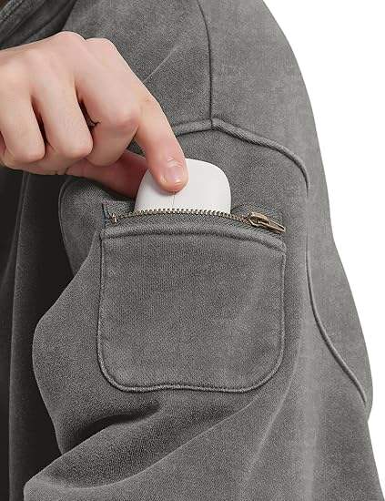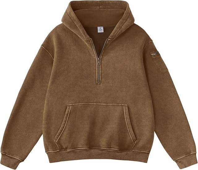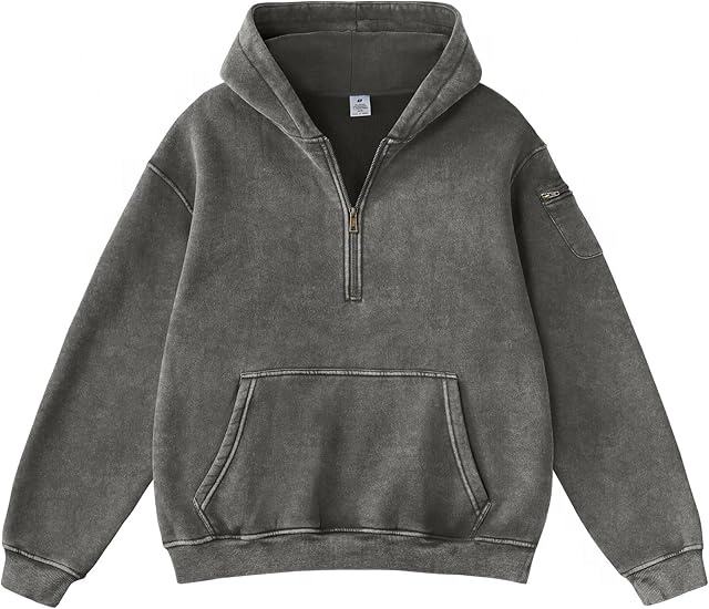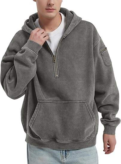 Sweat à capuche oversize vintage en molleton bouclette avec logo brodé personnalisé, fermeture éclair quart de tour, épaules tombantes, coupe évasée et effet délavé et vieilli