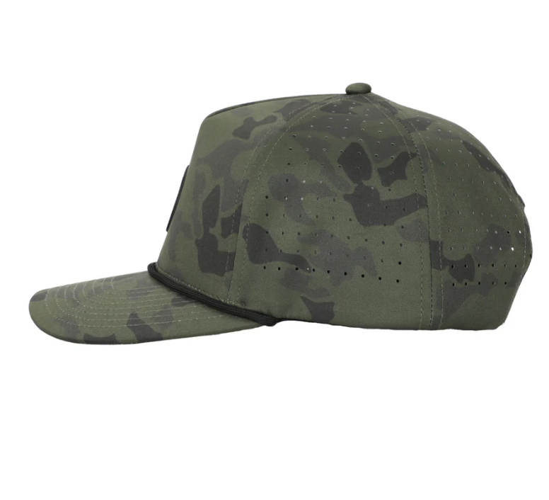 Casquette de golf et de baseball en corde sergé de polyester imperméable à l'eau avec logo brodé personnalisé découpé au laser et imprimée camouflage à 5 panneaux pour le sport