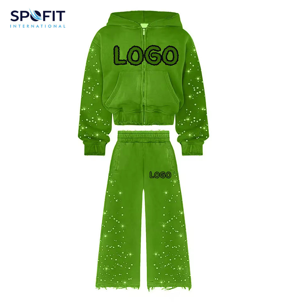 Streetwear avec logo brodé personnalisé survêtements lavés à l'acide patch lavé à l'acide pantalons de survêtement et sweat à capuche ensembles de sweat à capuche en strass