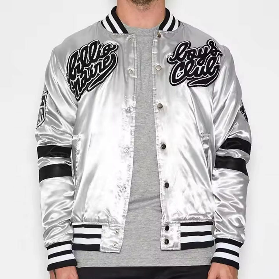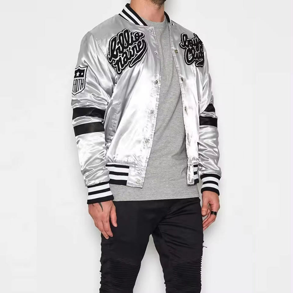 Veste en satin avec logo brodé sur mesure Veste universitaire en satin léger pour hommes et femmes Blousons bombardiers en chenille avec logo
