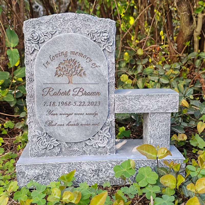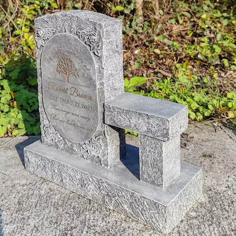 Banc commémoratif gravé sur mesure, pierre tombale en résine à face unique avec sculptures d'arbre de vie et de rose, décoration de jardin pour cimetière