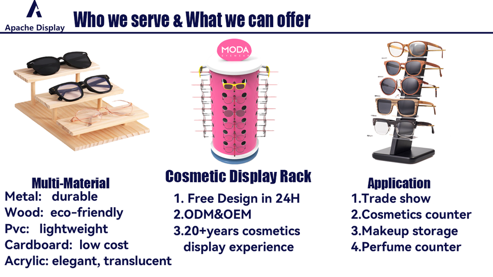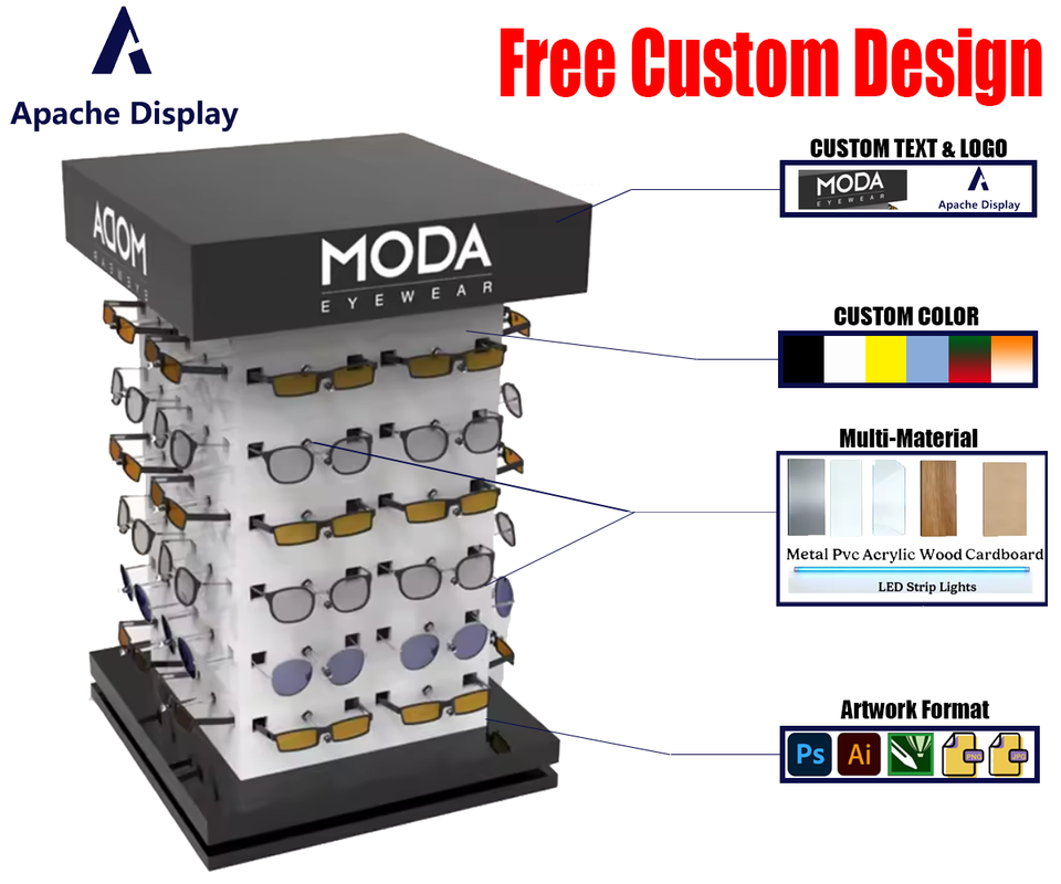 Présentoir à lunettes personnalisé pour opticien – Support de luxe pour lunettes de vue et de soleil en métal, acrylique et bois – Unité de présentation de marque pour magasin de détail Apache