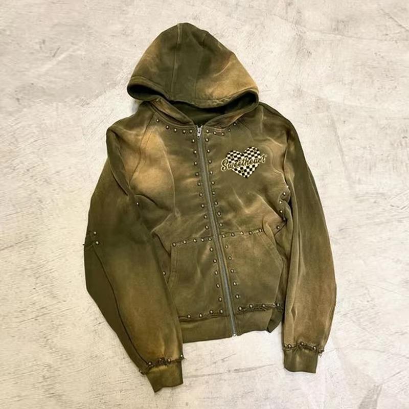 Faleece personnalisé surdimensionné poids lourd fermeture éclair lavage à l'acide vintage strass personnalisé en détresse broderie Patch à capuche hommes