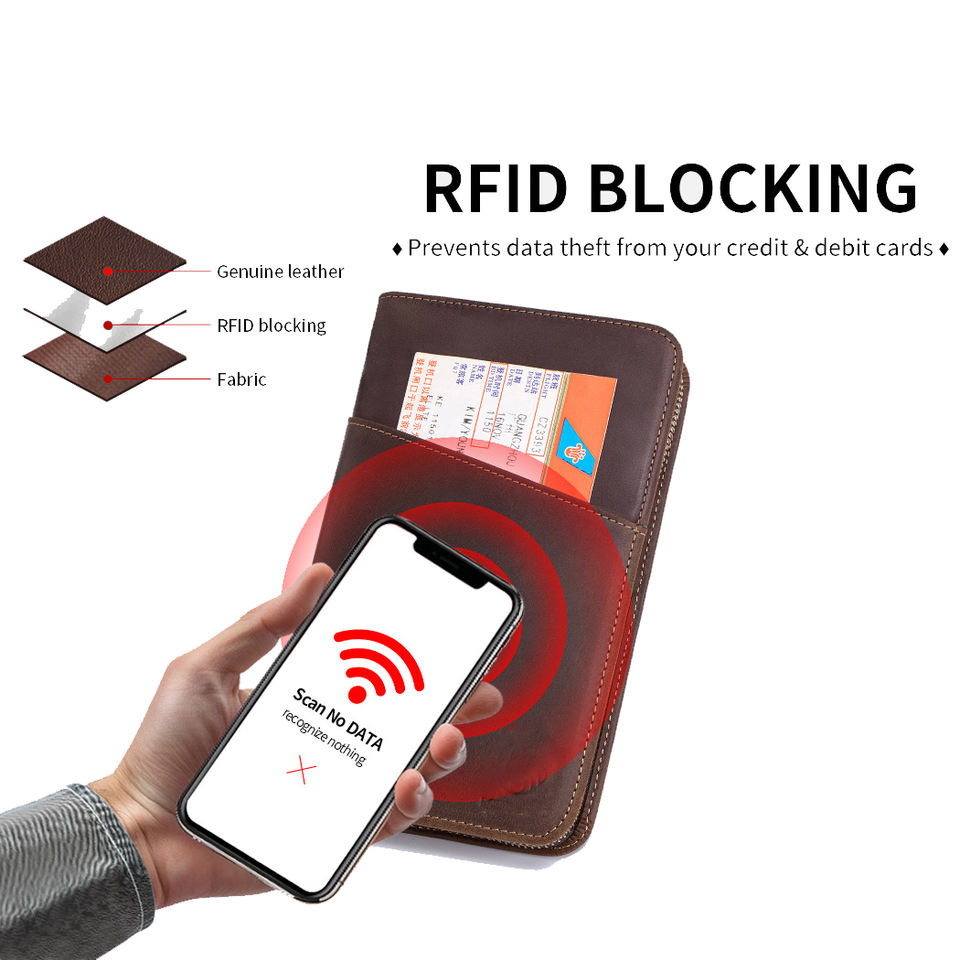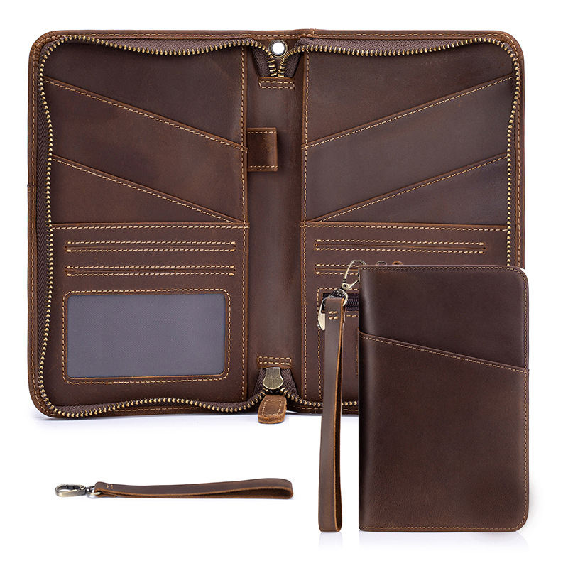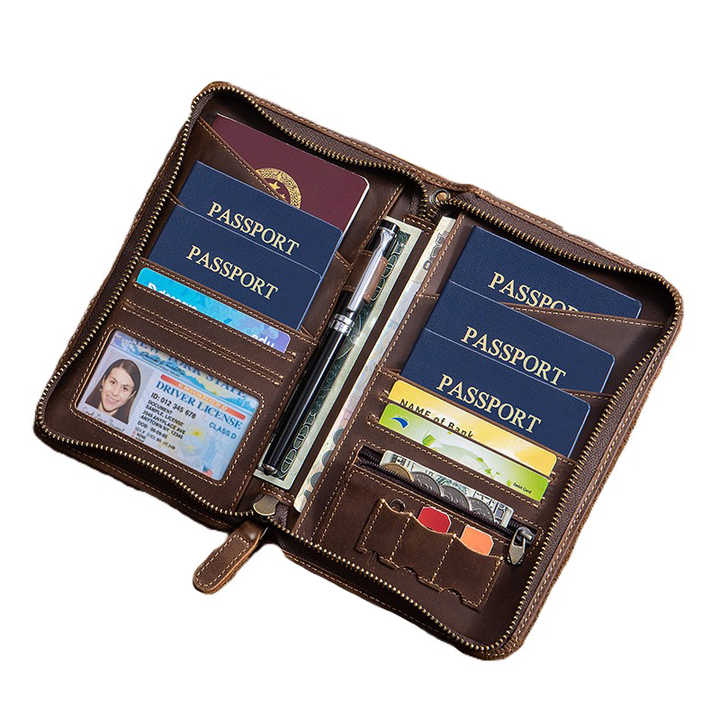 Portefeuilles en cuir véritable pour documents de voyage personnalisés pour la famille, avec fermeture éclair, porte-cartes, étui pour passeport, cuir Crazy Horse café