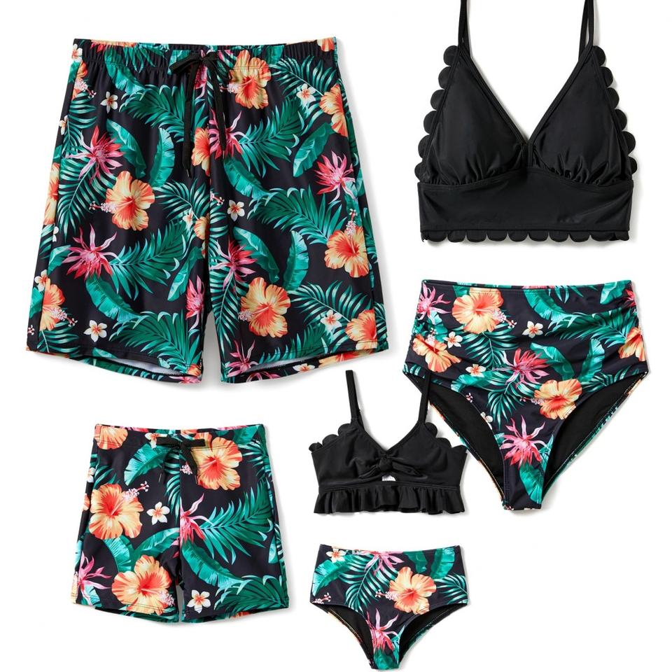 Maillot de bain personnalisé pour maman et moi, imprimé feuilles, col en V, maillots de bain assortis pour la famille, bikini de plage, ensemble de 4 pièces