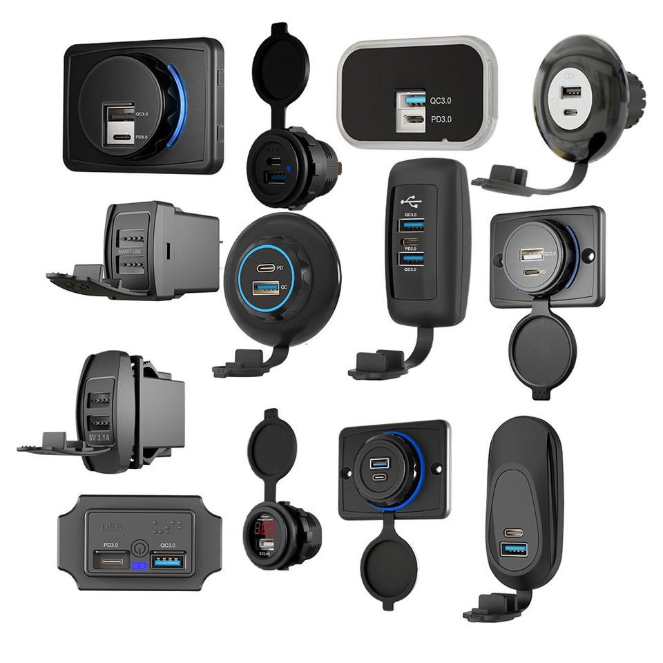 Chargeur de voiture universel personnalisé à charge rapide 12V 24V pour chariot, moto, scooter électrique, avec ports USB-A QC3.0 et USB-C PD3.0, résistant aux flammes