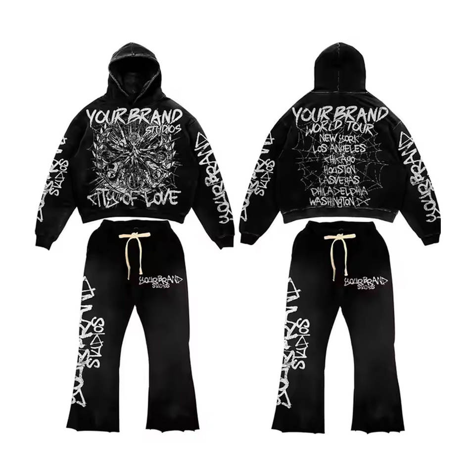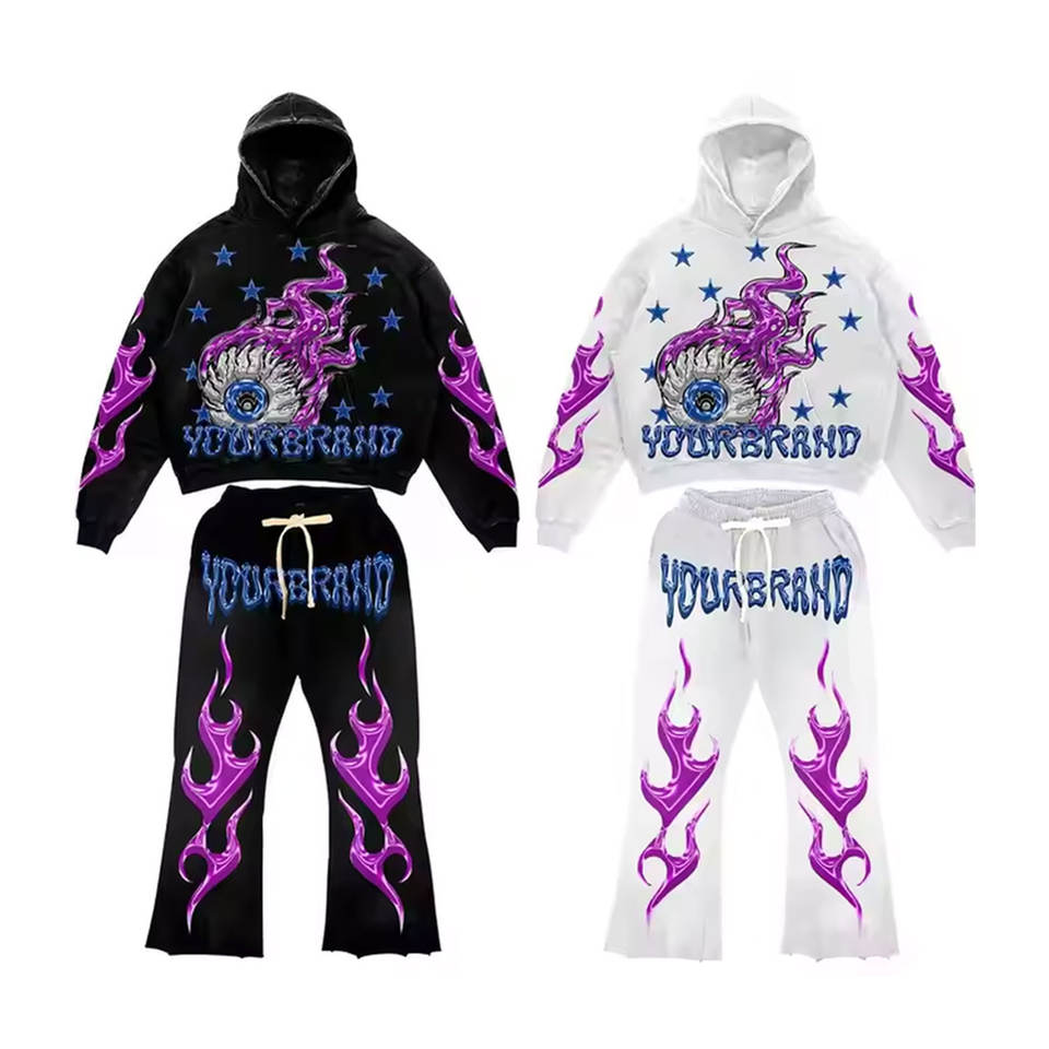 Ensemble de survêtement évasé personnalisé pour homme, style streetwear, avec impression 3D en relief, comprenant un sweat à capuche et un pantalon de jogging, à ourlet brut, motif graphique, décontracté
