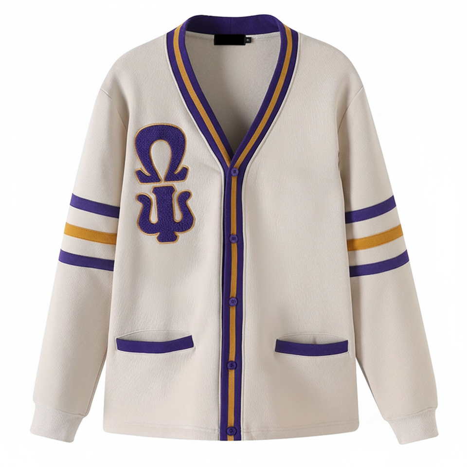 Personnalisé Fraternité OPP Omega Neutre Polaire Cardigan Col V Hommes Pull D'hiver Chenille Brodé Lettres Grecques bouton Avant