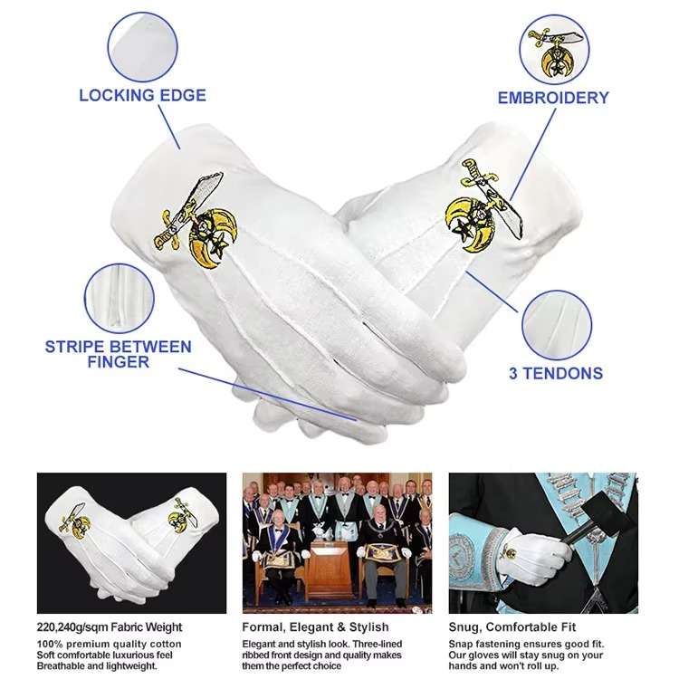 Gants maçonniques en coton blanc de taille libre personnalisés fabriqués avec le logo maçonnique en métal pour gants