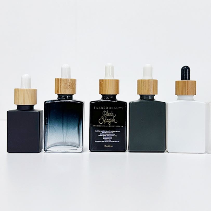 Flacon compte-gouttes carré givré ambré personnalisé 30 ml, flacon compte-gouttes rectangulaire carré en verre givré ambré noir, blanc, brun avec compte-gouttes en bambou