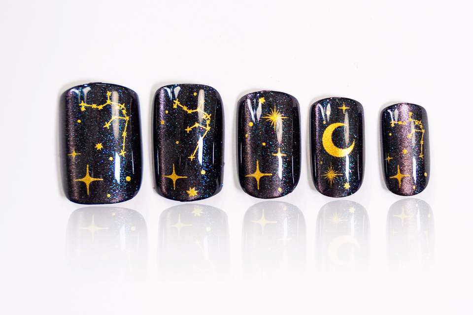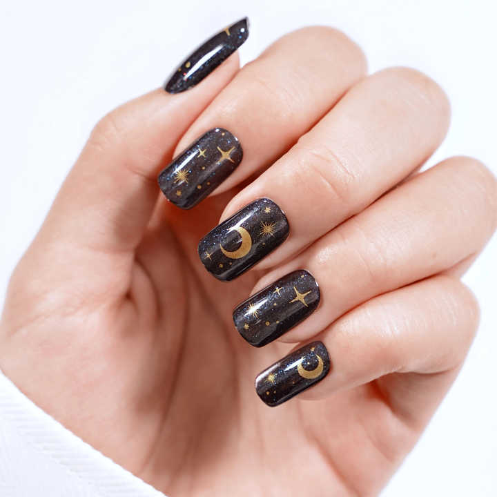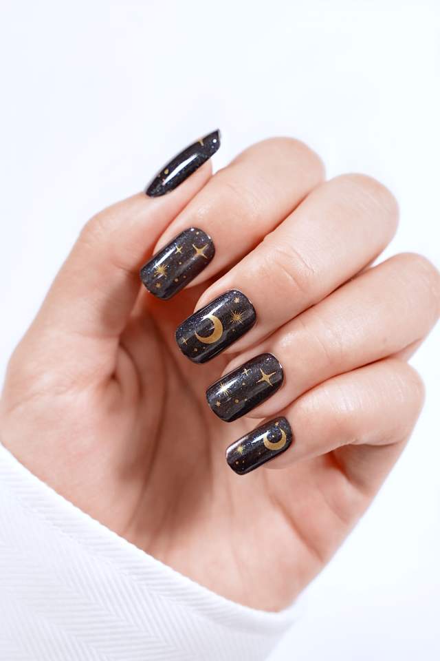 24 faux ongles en ABS noirs scintillants, forme amande, motif céleste, OEM ODM personnalisé, galaxie, lune, étoile, à presser