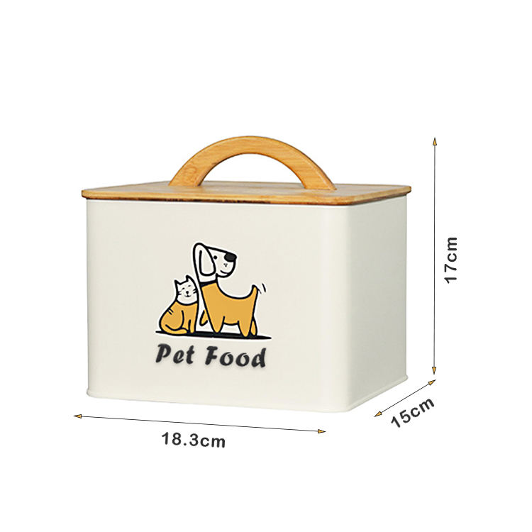 Boîte de rangement pour croquettes de chat en fer galvanisé personnalisé Boîte en métal avec couvercle en bois pour friandises pour chiens Boîte en métal avec couvercle rectangulaire en bambou pour aliments pour animaux domestiques