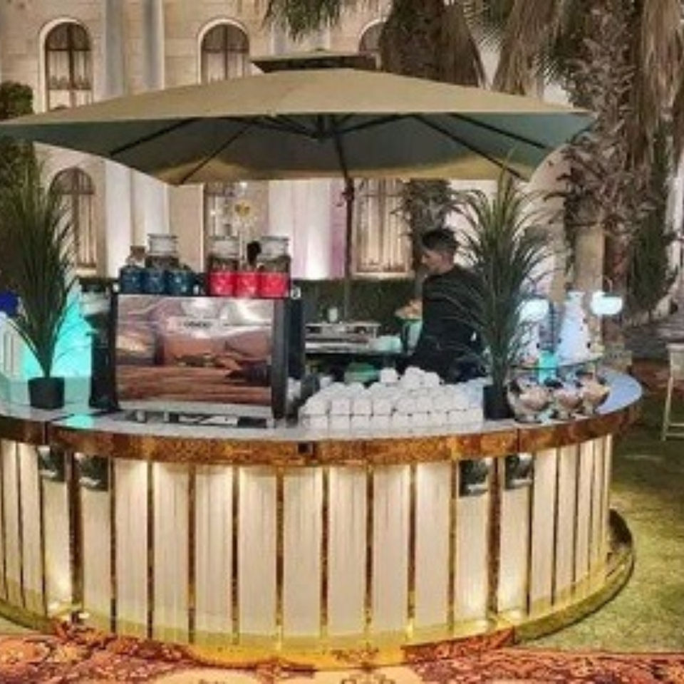 Comptoir de buffet de mariage luisant personnalisé avec panneaux lumineux et thème sombre pour réceptions et fêtes de luxe