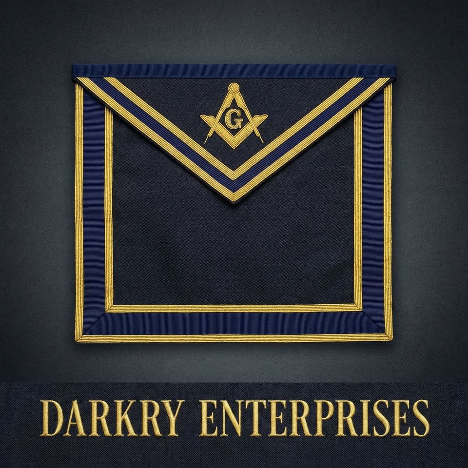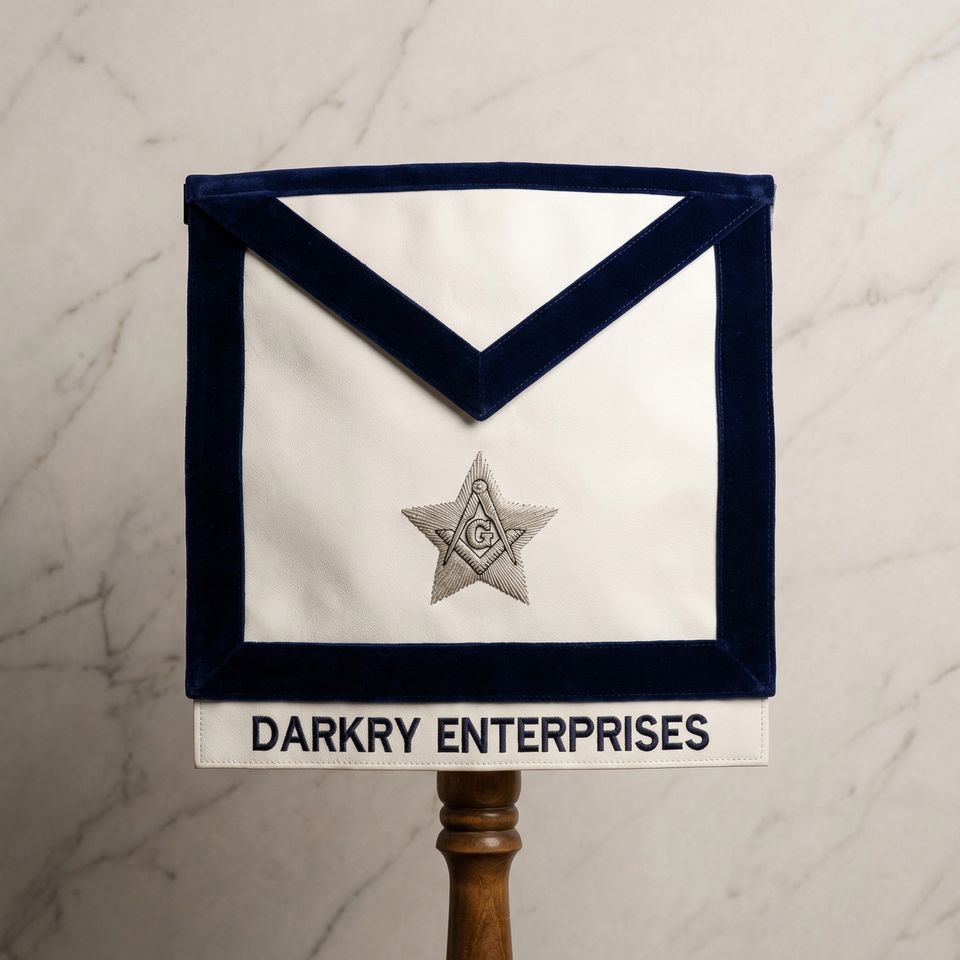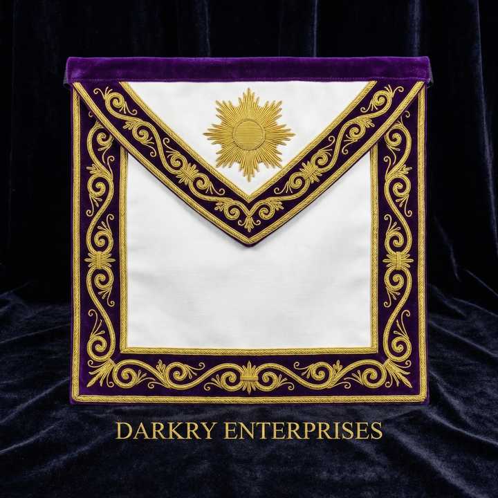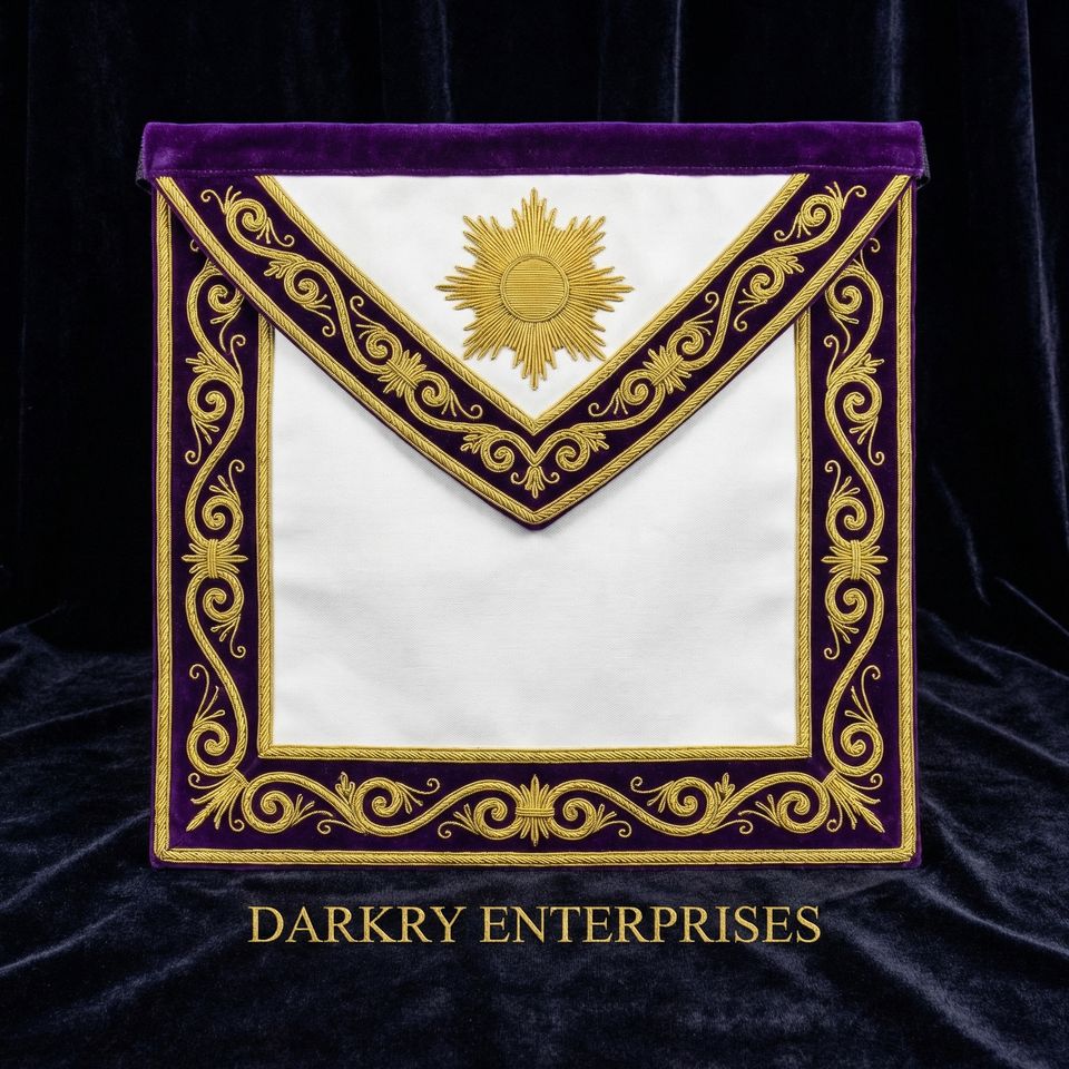 Tablier d'officier maçonnique personnalisé en velours bleu marine avec broderie fil d'or, bordure violette et couronne de laurier, fait main, pour la franc-maçonnerie