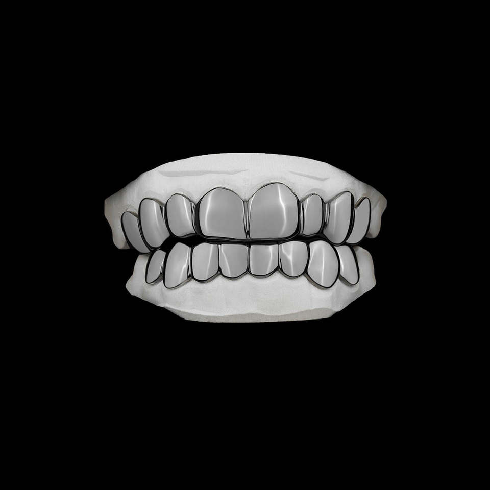 Grilles dentaires complètes de style gothique personnalisées, noir et argent, plaqué or, finition chrome poli, pour dents supérieures et inférieures, style hip-hop, finition fine
