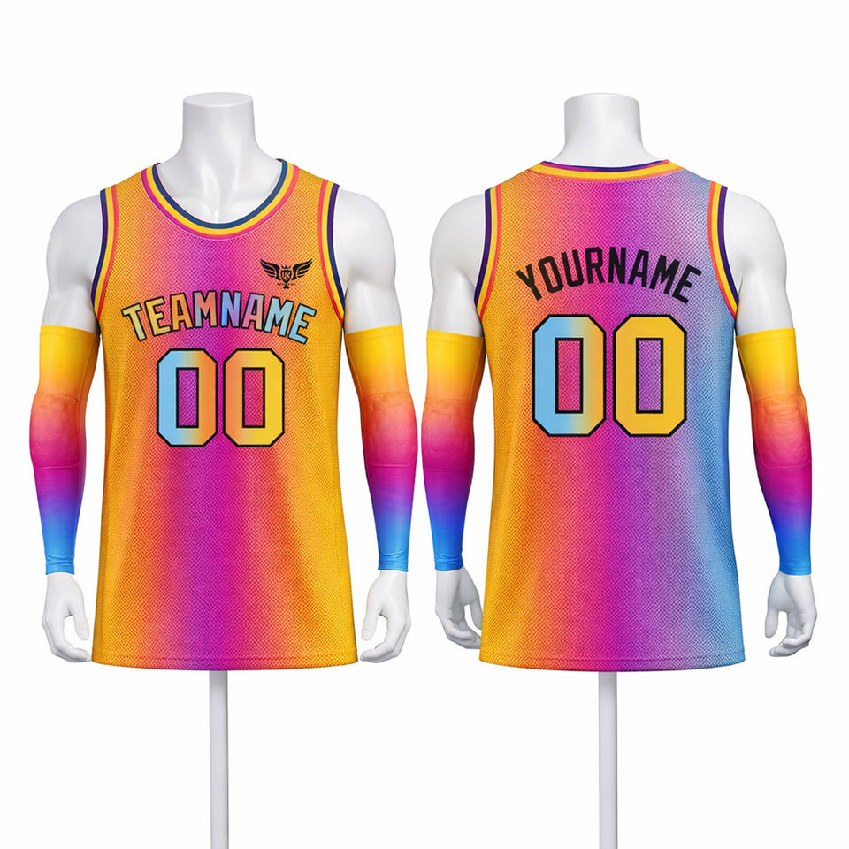 Maillot de basket-ball personnalisé à dégradé avec manchons, uniforme d'équipe en maille sans manches pour hommes, sublimation arc-en-ciel, nom et numéro personnalisés