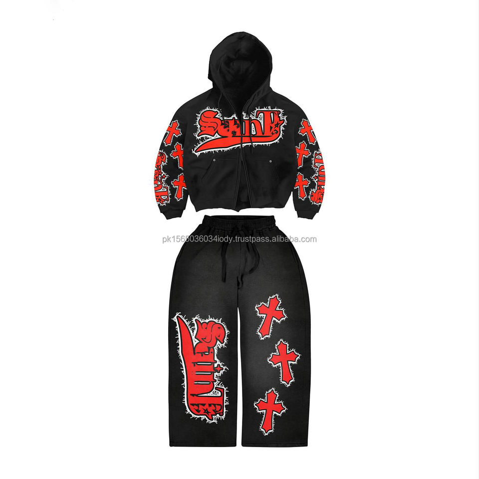 Ensemble survêtement streetwear homme en coton, avec sweat à capuche zippé et pantalon de survêtement évasé, motif graphique personnalisé, délavé, effet acid wash et strass