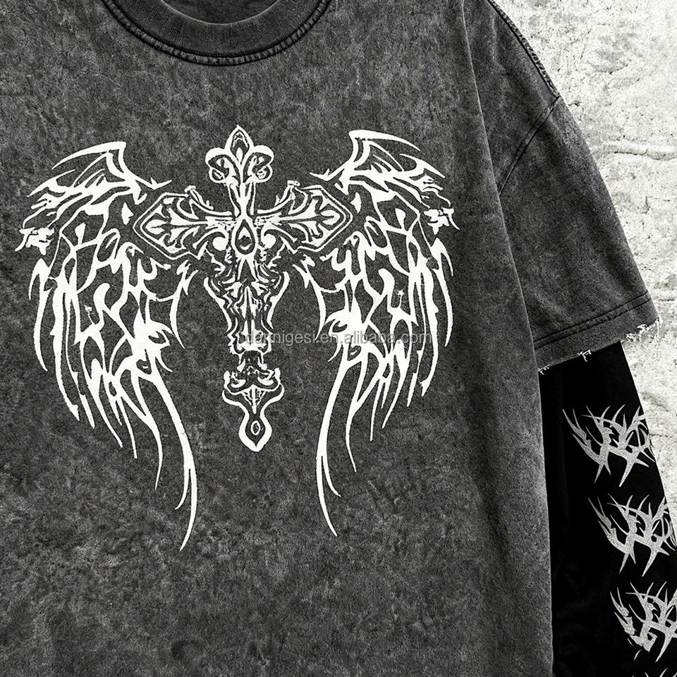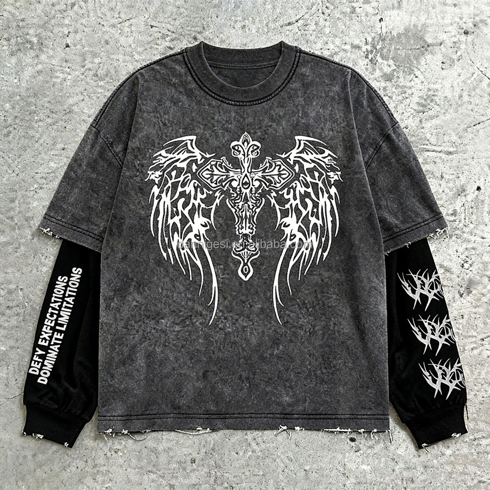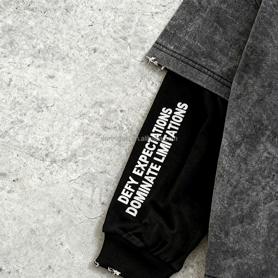 T-shirts à manches longues déchirés avec motifs personnalisés pour hommes, style vintage délavé à l'acide, en tissu gaufré, effet vieilli, double couche